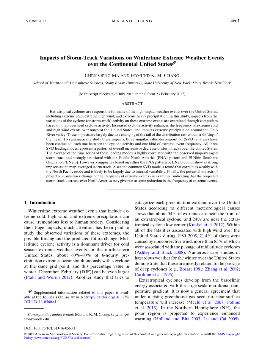 包括极端低温,强风和极端降水在内的冬季极端天气事件可能给人类社会带来巨大损失。由于它们带来的巨大影响,人们已经非常注意研究观察到的极端变化,可能的强迫因子和预测的未来变化。中纬度气旋活动是寒冷季节极端天气事件的主要驱动因素。在美国东北部,大约60%-80%的6小时降水极值与同一网格点的旋风同时发生,冬季[12月—2月(DJF)]的这个百分比值可能更大(Pfahl和Wernli 2012)。另一项研究试图根据不同的气象原因对美国各个降水极值进行分类,结果显示大约54%的极值位于温带气旋前方附近,24%位于温带气旋中心附近(Kunkel等人,2012))。在1980—2005年间与美国大风相关的所有死亡事故中,其中21.4%是由非对流风造成的,其中83%以上与中纬度旋风有关(Ashley和Black 2008)。美国冬季危险天气的大量案例研究表明,这些研究主要与深厚气旋的路径有关(例如,Bosart 1981; Zhang等2002; Cardone等1996)。