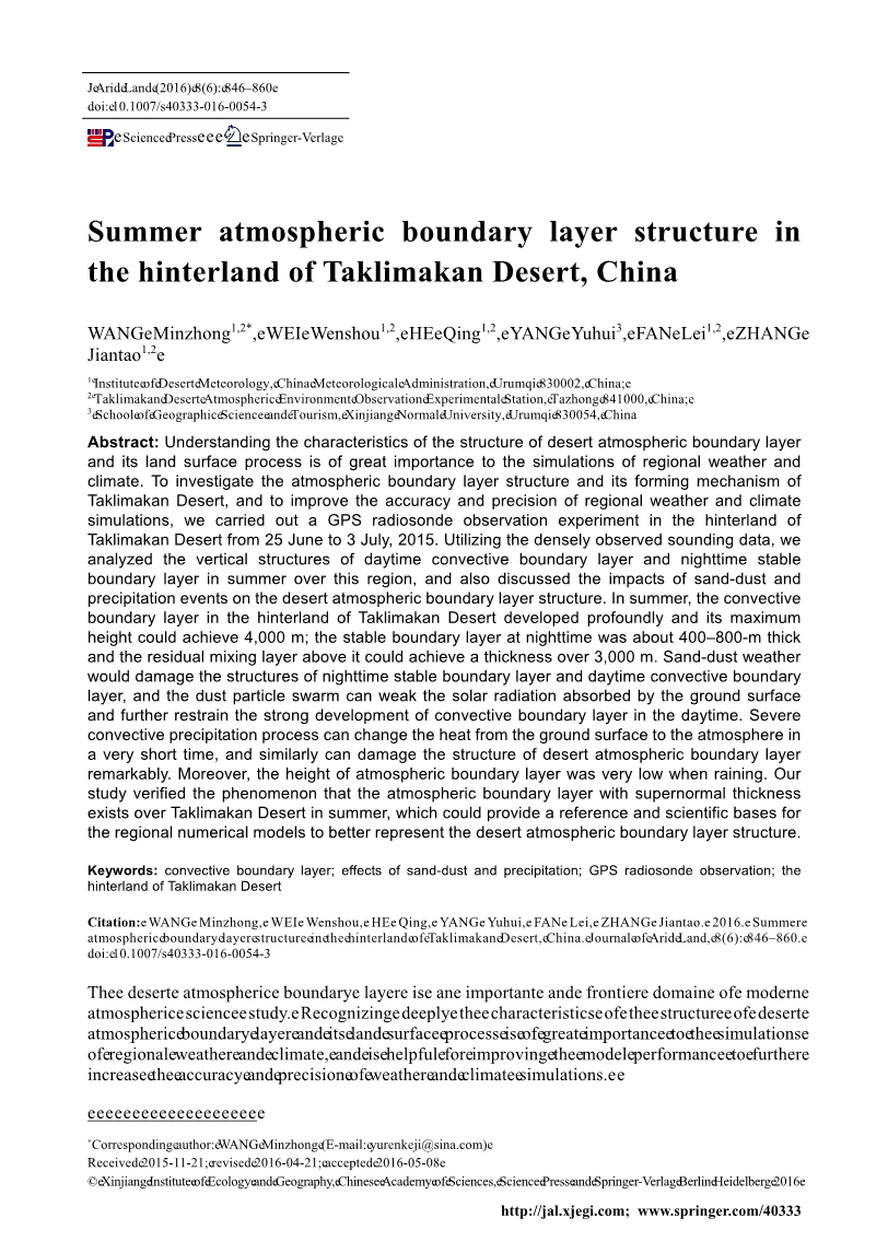 关键词:对流边界层;沙尘和降水的影响;GPS无线电探空仪观测;塔克拉玛干沙漠的腹地