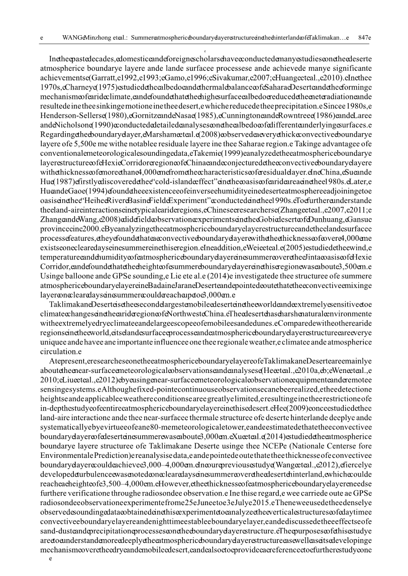 (1994)发现在20世纪90年代进行的“黑河流域实验”中,与绿洲相邻的沙漠大气中存在 逆湿度。为进一步了解典型干旱地区的陆气相互作用,中国研究人员(Zhang et al。, 2007,2011; Zhang and Wang,2008)于2000年在甘肃省敦煌戈壁沙漠进行了野外观测实验。大气边界层结构和地表过程特征,他们发现该地区夏季晴天存在厚度超过4000米的对流边 界层。另外,魏等人。(2005)研究了河西走廊金塔绿洲夏季大气边界层的风,温度和湿 度,发现该区夏季边界层高度约为3500米。利用气球和GPS发声,李等人。(2014)研究了 巴丹吉林沙漠夏季大气边界层的构造,并指出夏季晴天的对流混合层可达3000米。