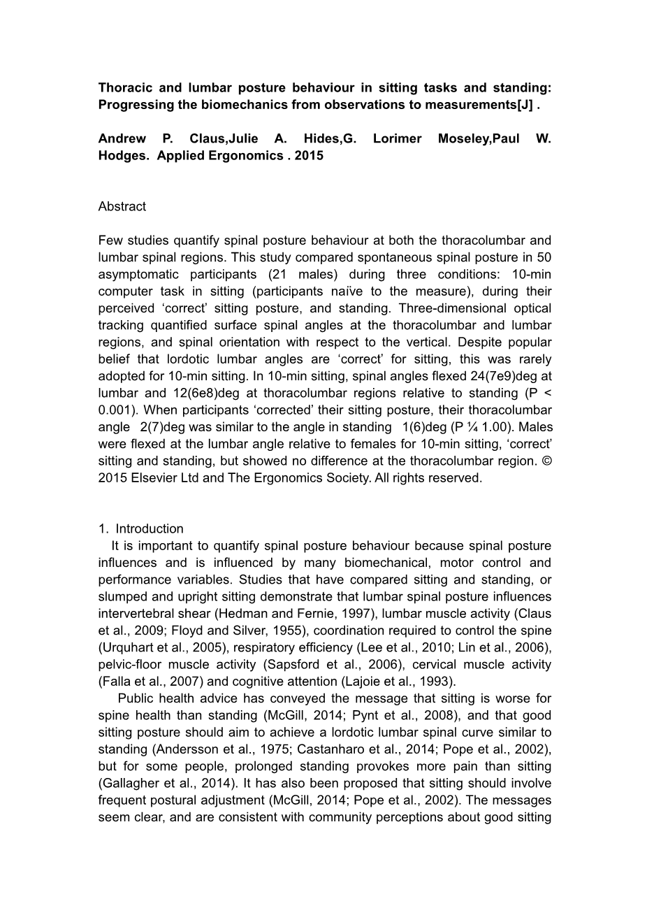 坐姿和站立时的胸腰椎姿势行为:从观察到测量的生物力学进展外文翻译资料