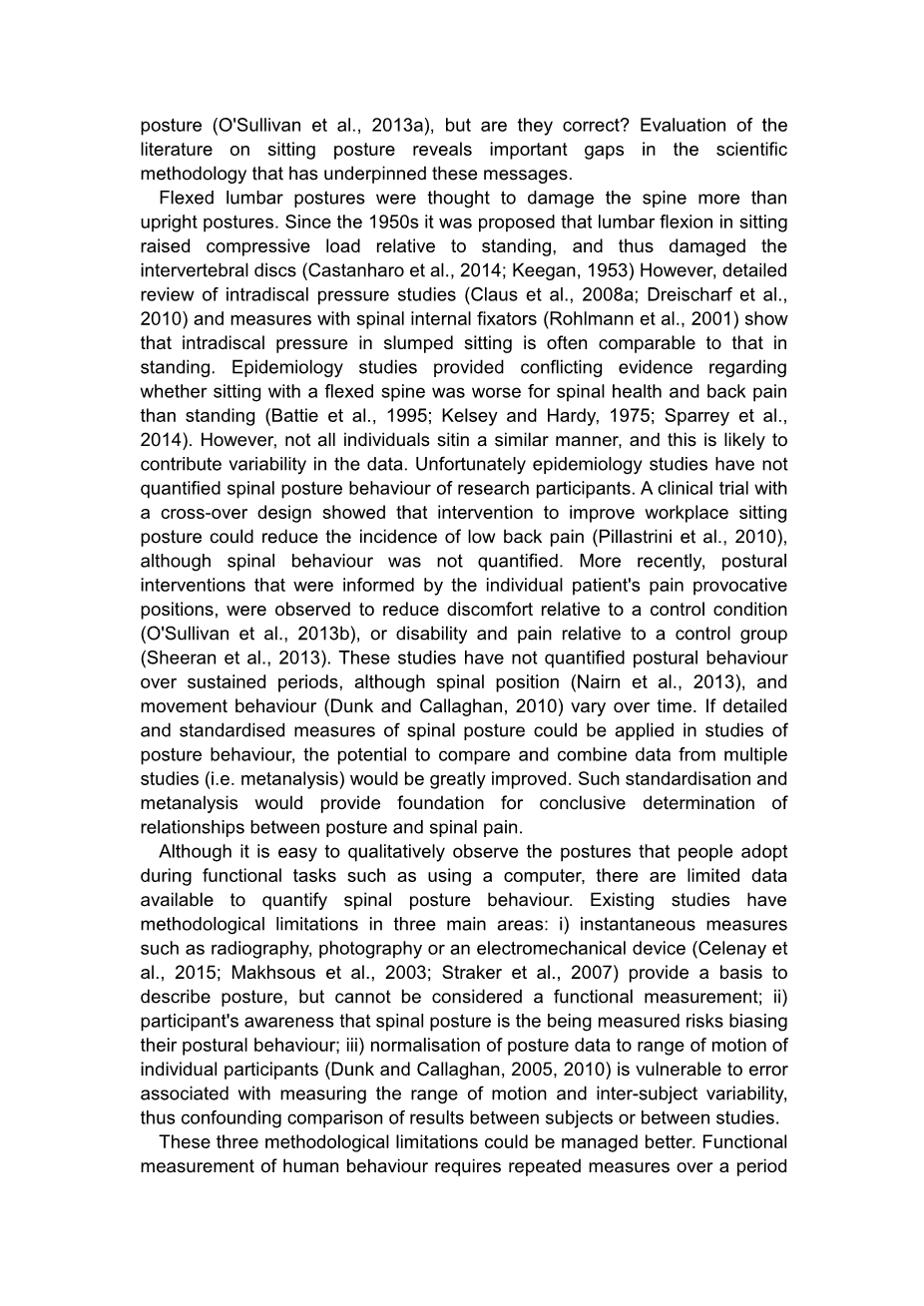 弯曲的腰椎姿势被认为比直立姿势对脊柱的损害更大。自20世纪50年代以来,有学者提出坐着时腰椎屈曲会增加相对于站立时的压缩负荷,从而损伤椎间盘(Castanharo et al., 2014;然而,内部压力研究的详细回顾(Claus等,2008a;(Dreischarf et al., 2010)和使用脊柱内固定器的测量(Rohlmann et al., 2001)表明,瘫坐状态下的肌内压通常与站立状态下的肌内压相当。流行病学研究提供了相互矛盾的证据,关于弯曲脊柱坐着是否比站着对脊柱健康和背部疼痛更糟糕(Battie et al., 1995;凯尔西和哈迪,1975年;Sparrey et al., 2014)。然而,并不是所有的个体都以相似的方式表达,这可能导致数据的可变性。不幸的是,流行病学研究还没有量化研究参与者的脊柱姿势行为。一项交叉设计的临床试验表明,改善工作场所坐姿的干预可以减少腰痛的发生率(Pillastrini et al., 2010),尽管脊柱行为没有被量化。最近,通过观察个别患者的疼痛刺激姿势,观察到体位干预可减少相对于对照组的不适(Orsquo;sullivan et al., 2013b),或相对于对照组的残疾和疼痛(Sheeran et al., 2013)。这些研究没有对持续时间内的姿势行为进行量化,尽管脊柱位置(Nairn et al., 2013)和运动行为(Dunk和Callaghan, 2010)随着时间的推移而变化。如果脊柱姿势的详细和标准化测量可以应用于姿势行为的研究,那么比较和合并来自多个研究的数据(即元分析)的潜力将会大大提高。这种标准化和元分析将为最终确定姿势和脊柱疼痛之间的关系提供基础。