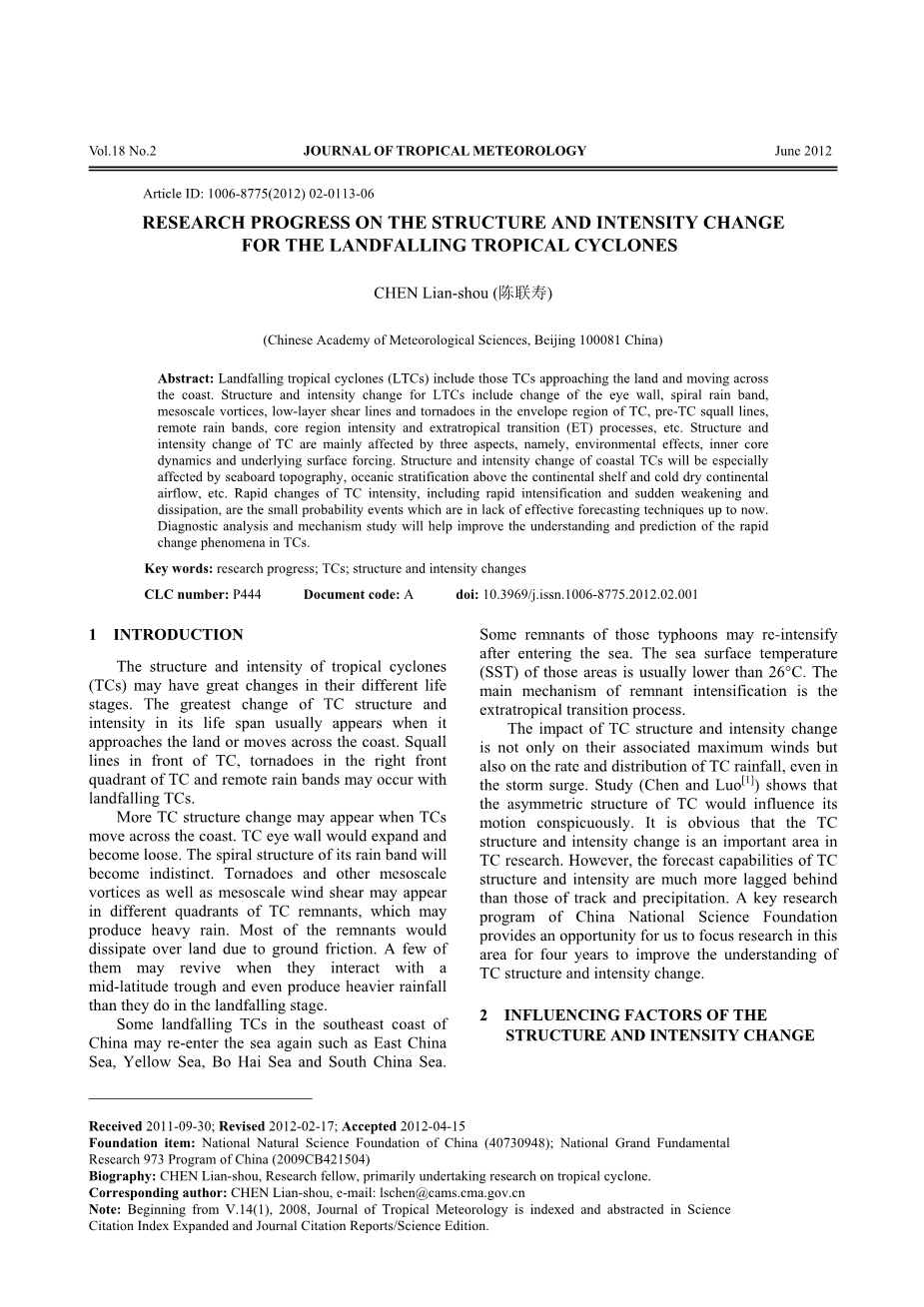 热带气旋的结构和强度变化不仅是对自己产生的最大风速也对速率和热带气旋降雨分布,甚至对风暴潮产生影响。研究(陈和罗[1])表示热带气旋的非对称结构将显著地影响它的运动。显然,热带气旋的结构和强度变化是热带气旋研究的重要领域。然而,热带气旋结构和强度的预报能力比它们的追踪和降水的预报能力滞后许多。中国国家科学基金会的一个主要研究计划提供了一个机会,让我们关注四年来在这方面的研究,以此来改善对热带气旋的结构和强度变化的认识。