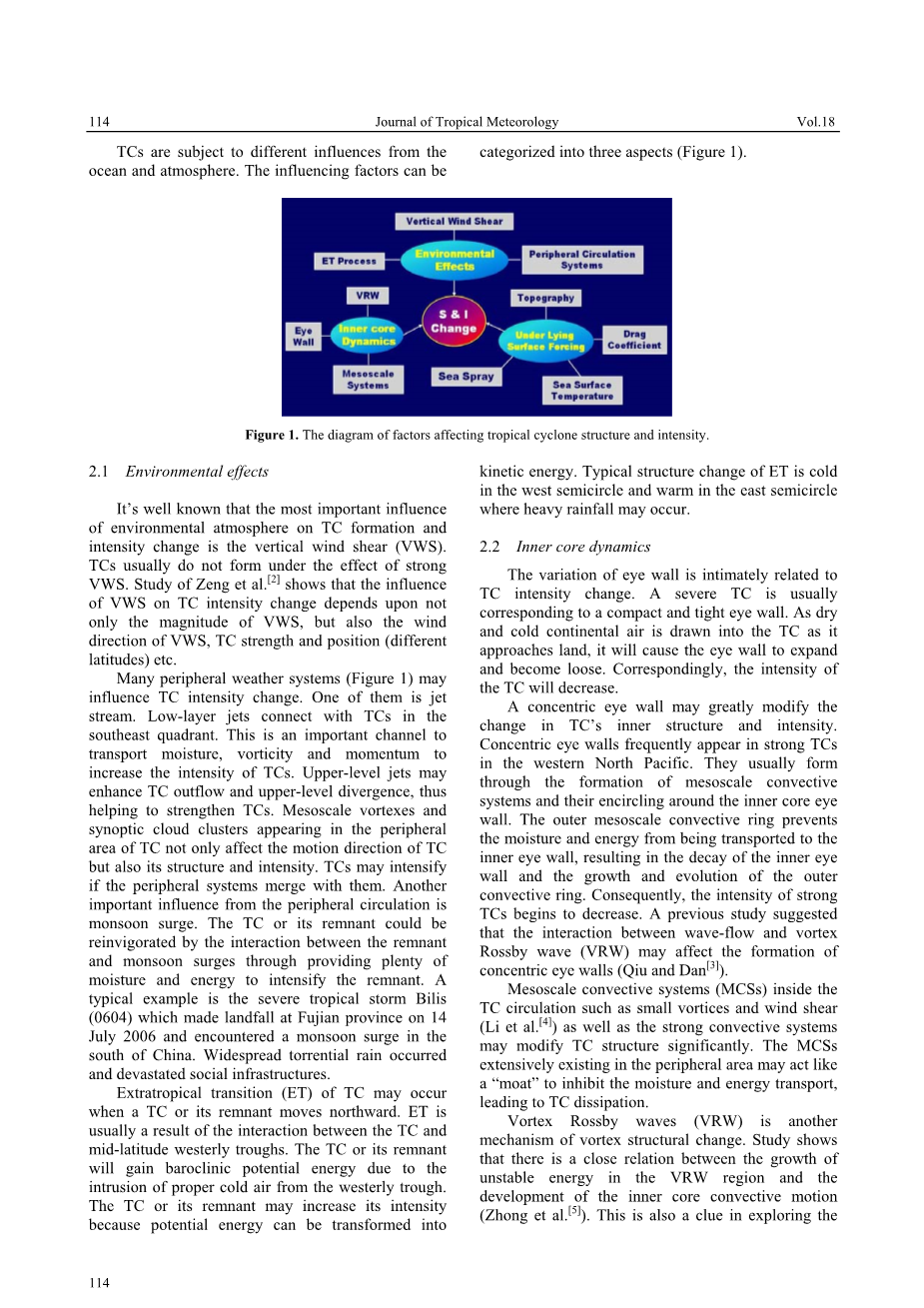 许多外围天气系统(图1)可能会影响热带气旋强度变化。其中之一是急流。在东南象限低空急流与热带气旋相连处,是运输水分、涡度和动量来增加台风强度的重要渠道。高空急流可以提高热带气旋外流和高空发散,从而帮助加强气旋。中尺度的涡旋和天气云团出现在热带气旋的周边区域,不仅影响热带气旋的运动方向,还有其结构和强度。如果外围系统与它们合并,热带气旋可能会加剧。另一个重要影响是来自外周循环的季风潮。热带气旋或其残余部分可以通过残余部分和季风潮之间的相互作用,提供充足的水分和能量而被注入新的活力,来加强残余部分。一个典型的例子是强热带风暴碧利斯(0604),其在2006年7月14日登陆福建并在中国南部与季风潮相遇。出现大范围暴雨和摧毁社会基础设施。