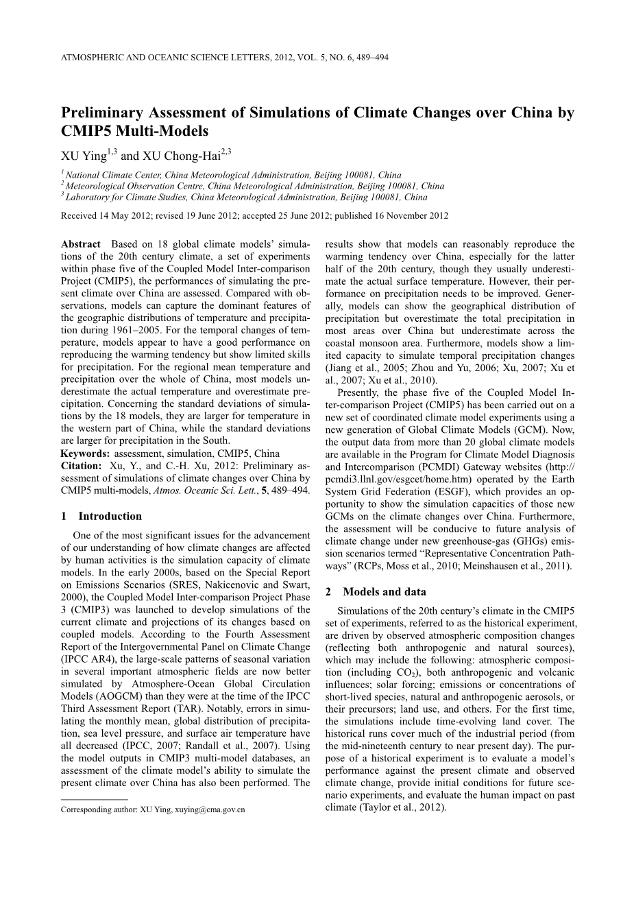 引用:Xu, Y., and C.H. Xu, 2012: Preliminary assessment of simulations of climate changes over China by CMIP5 multi-models, Atmos. Oceanic Sci. Lett., 5, 489–494.