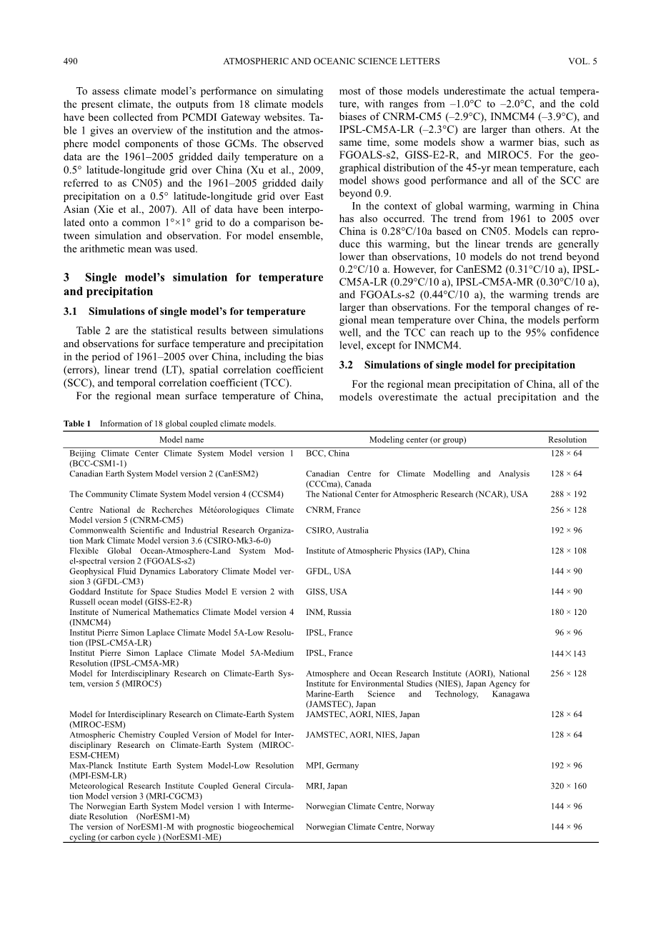 对气候系统模式的模拟能力进行评估有助于我们了解人类活动对气候变化的影响。在20世纪初期,基于排放情景的特殊报告(SRES,Nakicenovic和Swart,2000)发起的国际耦合模式比较计划第三阶段(CMIP3),其目的在于提高模式对现代气候的模拟能力,并且在耦合模式的基础上去预估未来气候变化。根据政府间关于气候变化的第四次报告(IPCC AR4),与IPCC第三次报告相比,海气耦合的全球环流模式(AOGCM)可以更好的模拟出若干重要大气场中的大尺度季节变化型。值得注意的是,海气耦合的全球环流模式对于降水的全球分布、海平面气压、近地面月平均温度的模拟偏差均有所减小(IPCC,2007;Randall等,2007)。使用CMIP3多模式数据集的模式输出结果来评估气候模式对现代中国区域气候的模拟能力,结果显示,尽管各模式经常低估实际的地表温度,但各模式基本可以模拟出中国区域的变暖趋势,特别是20世纪后半叶。但是,各模式对于降水的模拟能力仍有待提高。通常来说,各模式可以模拟出降水的空间分布型,但对于中国区域的总降水量模拟值偏高,对于沿海地区季风降水量的模拟值偏低。并且,各模式对于降水的时间变化模拟能力有限(Jiang等,2005;Zhou和Xu,2006;Xu,2007;Xu等,2007;Xu等,2010)。