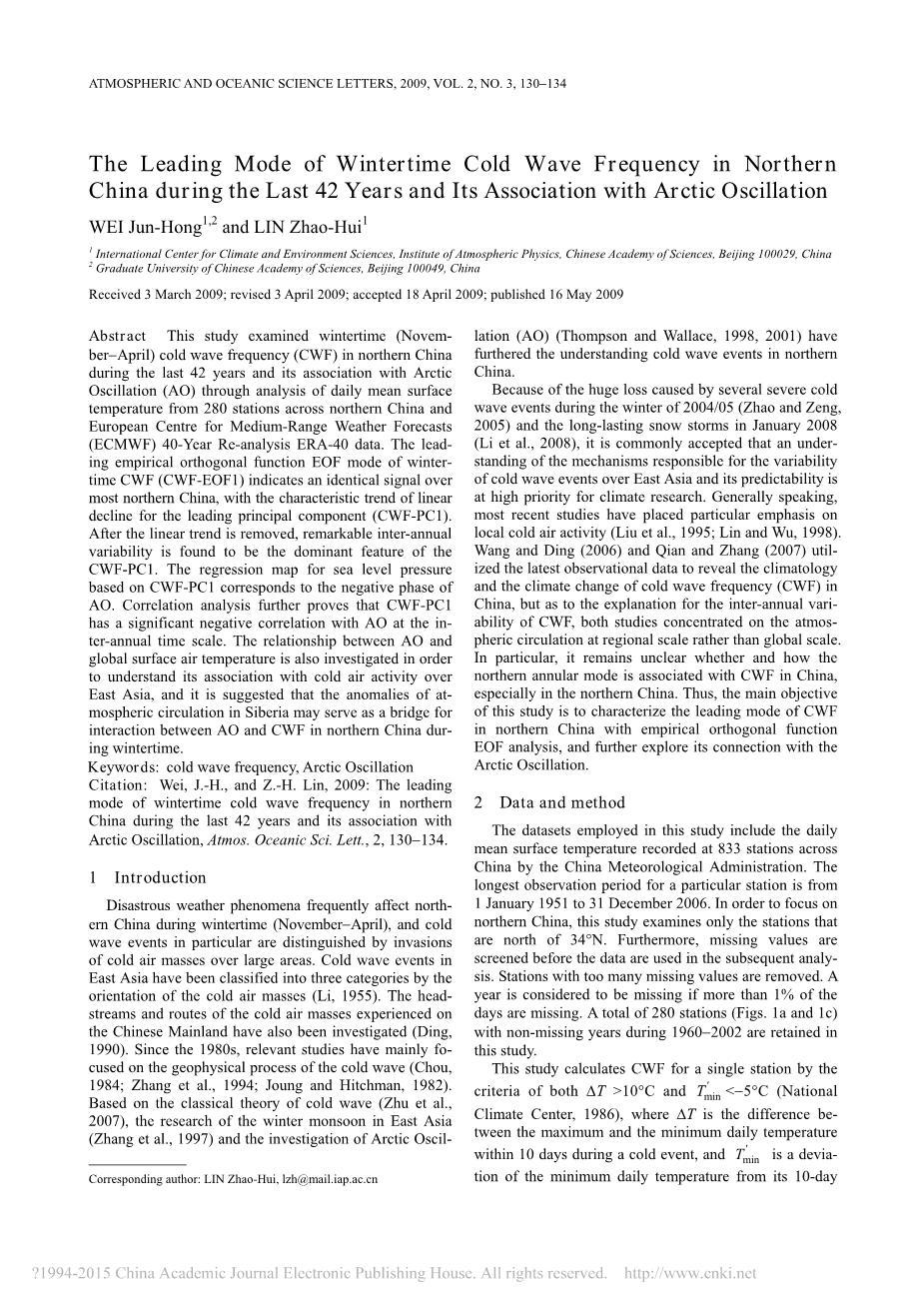 摘要:本研究通过分析中国北方280个站逐日平均地表温度和欧洲中期天气预报中心(ECMWF)40年再分析ERA-40数据,考察了过去42年中国北方冬季(11月-4月)寒潮频次及其与北极涛动的联系。冬季的寒潮频次(CWF)主导经验正交函数EOF模态CWF(CWF-EOF1)表明中国北方大部分地区具有相同的信号,主模态(CWF-PC1)具有线性下降的趋势特征。去除线性趋势之后,发现CWF-PC1具有显著的年际变化特征。基于CWF-PC1的海平面气压回归图对应AO的负位相。相关分析进一步证明,CWF-PC 1在年际时间尺度上与AO具有显著的负相关关系。为了了解AO与东亚冷空气活动的联系,还研究了AO与全球地表温度之间的关系,结果表明西伯利亚大气环流异常可能作为冬季AO和中国北方CWF之间相互作用的桥梁。