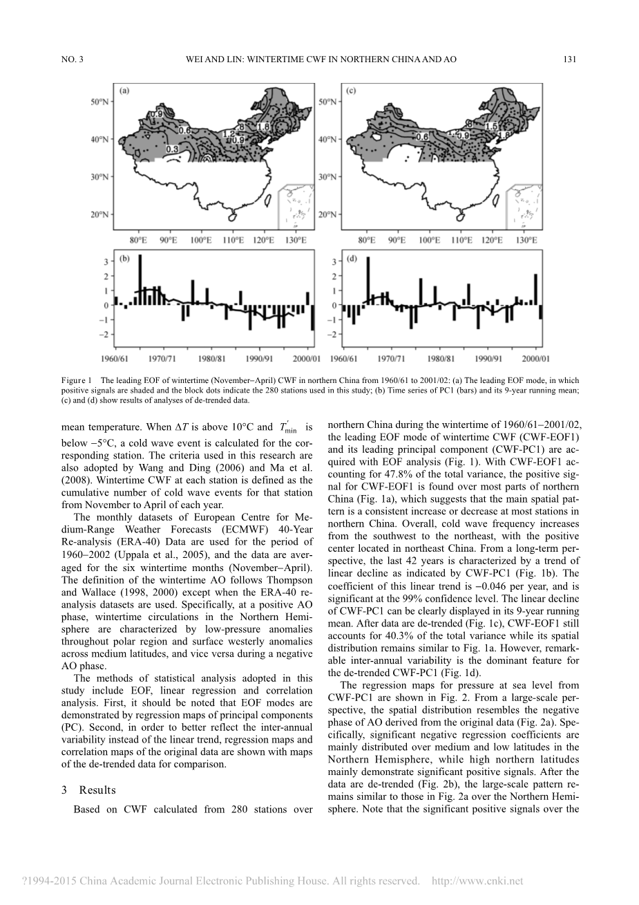 基于在1960 / 61-2001 / 02冬季期间从中国北方280个站点计算的CWF,利用EOF分析获得了冬季CWF(CWF-EOF1)的主导EOF模式及其主要主成分(CWF-PC1)。由于CWF-EOF1占总方差的47.8%,在中国北部大部分地区发现了CWF-EOF1的正信号(1a),这表明中国北方大部分站的主要空间格局是一致的增加或减少。总体而言,寒潮频率从西南向东北增加,正中心位于中国东北部。 从长期角度看,最近42年的特征是线性下降的趋势,如CWF-PC1所示(1b)。该线性趋势的系数是每年-0.046,并且在99%的置信水平是显著的。CWF-PC1的线性下降可以在其9年运行中清楚地显示。在数据被去除之后(1c),CWF-EOF1仍然占总方差的40.3%,而其空间分布保持类似于图1a。然而,显著的年际变率是偏向的CWF-PC1的主要特征(1d)。