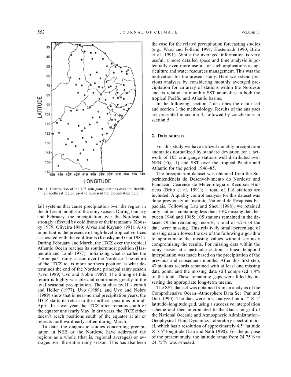 到目前为止,关于巴西东北部或巴西东北部北部的降水诊断的研究已经解决了把区域作为一个整体或者是做了整个雨季的平均。这也一直是降水相关预报研究的情况(比如:Ward and Folland 1991; Hastenrath 1990; Brito等人. 1991)。虽然平均信息是非常有用的,但更有利于农业和水资源管理应用的是更细致的时间和空间分析。这就是本研究的动机。现在我们扩展了以前的分析,考虑了巴西东北部北部站点序列的月平均降水和它与热带太平洋和大西洋流域的月海温异常的关系。