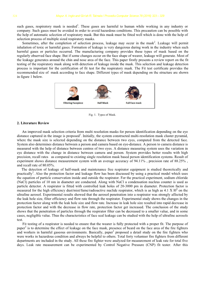 有时,在完成选择过程后,面罩可能会出现泄漏情况。泄漏将会导致呼入有毒或有害气体。在工业生产中,一旦出现这种有害气体或颗粒,面罩发生泄漏是非常危险的。制造公司会根据定期观察的脸型提供这些类型的面罩。但是,如果穿戴者的脸型发生了变化,那么出现面罩泄漏的现象。大部分的泄漏情况出现在脸部的下巴和鼻子周围。本文首先介绍了呼吸面罩的适配性试验和面罩内泄漏检测的研究进展。这种选择和泄漏检测过程对呼吸面罩适配性试验的认证具有重要意义。适配性测试证书根据面部形状提供面罩的推荐尺寸。图1显示了根据结构的不同类型的面罩。