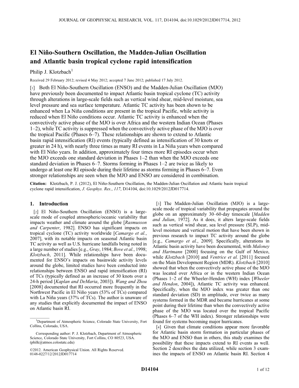 厄尔尼诺-南方涛动(ENSO)是影响全球天气和气候的大气/海洋耦合变化的一种大规模模式[Rasmusson and Carpenter, 1982]。ENSO对全球热带气旋(TC)活动具有显著影响[Camargo et al., 2007],其对季节性大西洋地区TC活动以及美国飓风登陆的显著影响已在大量研究中被注意到[例如,灰色,1984;Bove等,1998;Klotzbach, 2011]。虽然ENSO对全球全流域活动水平影响的关系已被记录下来,但对ENSO与TCs快速强化(RI)之间关系的研究有限(通常定义为24小时内增加30节[Kaplan and DeMaria, 2003])。Wang和Zhou[2008]记录到,与拉尼娜年(37%)相比,在厄尔尼诺年(53%),RI更频繁地发生在西北太平洋地区。作者尚不了解有任何明确记录ENSO对大西洋地区RI影响的研究。