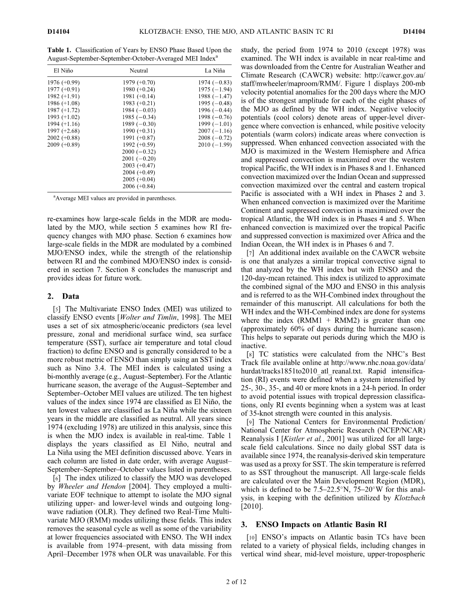 [5]利用多元ENSO指数(MEI)对ENSO事件进行分类[Wolter and Timlin, 1998]。MEI指数使用一组六个大气/海洋预测(海平面气压、纬向和经向表面风、海表面温度(SST),表面空气温度和总云分数)定义ENSO和通常被认为是一个更强的ENSO不仅仅是使用一个SST指数的指标如Nino3.4。MEI指数采用双月平均(如8月至9月)计算。在大西洋飓风季节,使用8 - 9月和9 - 10月MEI值的平均值。该指数自1974年以来的10个最高值被归为厄尔尼诺,10个最低值被归为拉尼娜,中间的16年被归为中性。本分析使用了自1974年以来的所有年份(不包括1978年),因为此时MJO指数是实时可用的。表1显示了使用上面讨论的MEI指数定义划分为厄尔尼诺、中性和拉尼娜的年份。每一列中的年份按日期顺序列出,括号中列出8月- 9月- 9月- 10月的平均值。