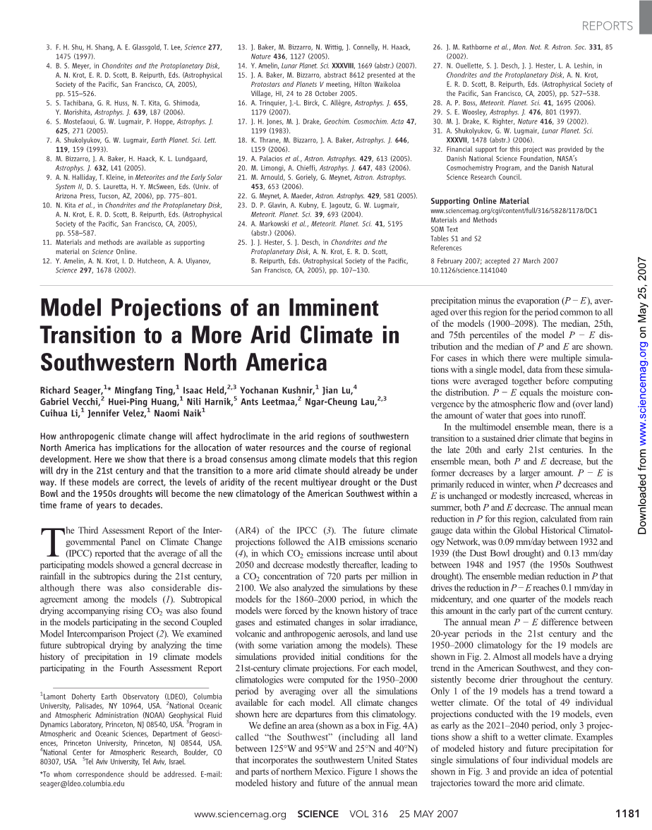 Richard Seager, 1 * Mingfang Ting, 1 Isaac Held, 2,3 Yochanan Kushnir, 1 Jian Lu, 4Gabriel Vecchi, 2 Huei-Ping Huang, 1 Nili Harnik, 5 Ants Leetmaa, 2 Ngar-Cheung Lau, 2,3Cuihua Li, 1 Jennifer Velez, 1 Naomi Naik 1