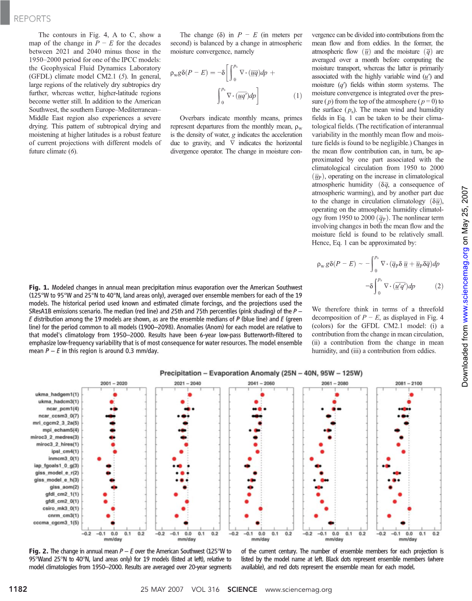 多模式的集成平均的结果显示,于20世纪末21世纪初开始有向持续的更干气候的过渡。在集成平均值中,P和E都有所减少,但是前者减少的更大些。P-E主要在冬季有所较少,当P减小时E保持不变或略有减少,然而在夏季,P和E两者都有所减少。根据全球历史气候网的雨量资料计算可知该地区的年均P的减少量在1932至1939年(沙尘暴干旱)为0.09mm/day,在1948至1957年(20世纪50年代干旱)为0.13mm/day。P的集成中值的减少导致到本世纪中期P-E的减少量达0.1mm/day,而有四分之一的模式显示在本世纪的初期就达到了该值。