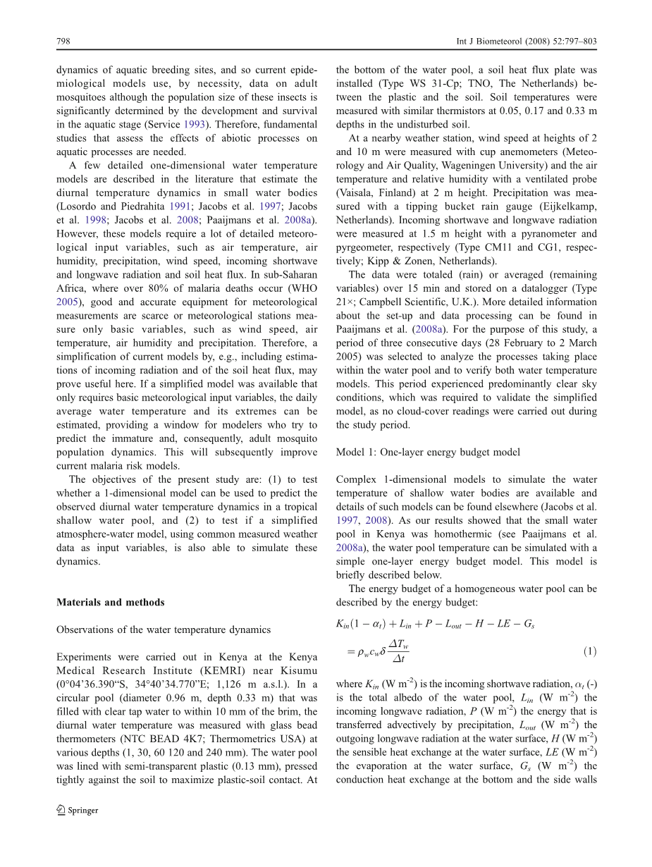 一些详细的一维水温模型在文献中被描述为估计小水体的昼夜水温动态(Losordo and Piedrahita 1991; Jacobs et al. 1997; Jacobs et al. 1998; Jacobs et al. 2008; Paaijmans et al. 2008a)。然而,这些模型需要大量的详细的气象输入变量,如空气温度、空气湿度、降水、风速、传入短波和长波辐射和土壤热通量。在疟疾死亡率超过80% 的撒哈拉以南的非洲地区(WHO 2005),缺少物资的和精确的气象测量设备或是当地气象站只测量气象基本变量,如风速、空气温度、空气湿度和降水。因此,当前模型的简化(例如,通过估计入射辐射和土壤热通量)在这里行之有效。如果一个简化的模型只需要基本的气象输入变量就能估计日平均水温,为试图预测幼虫的模型提供一个窗口,进而预测成年疟蚊的种族动态。随后这将改善当前疟疾风险模型。