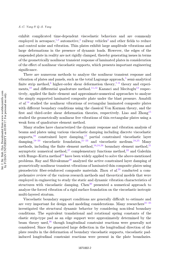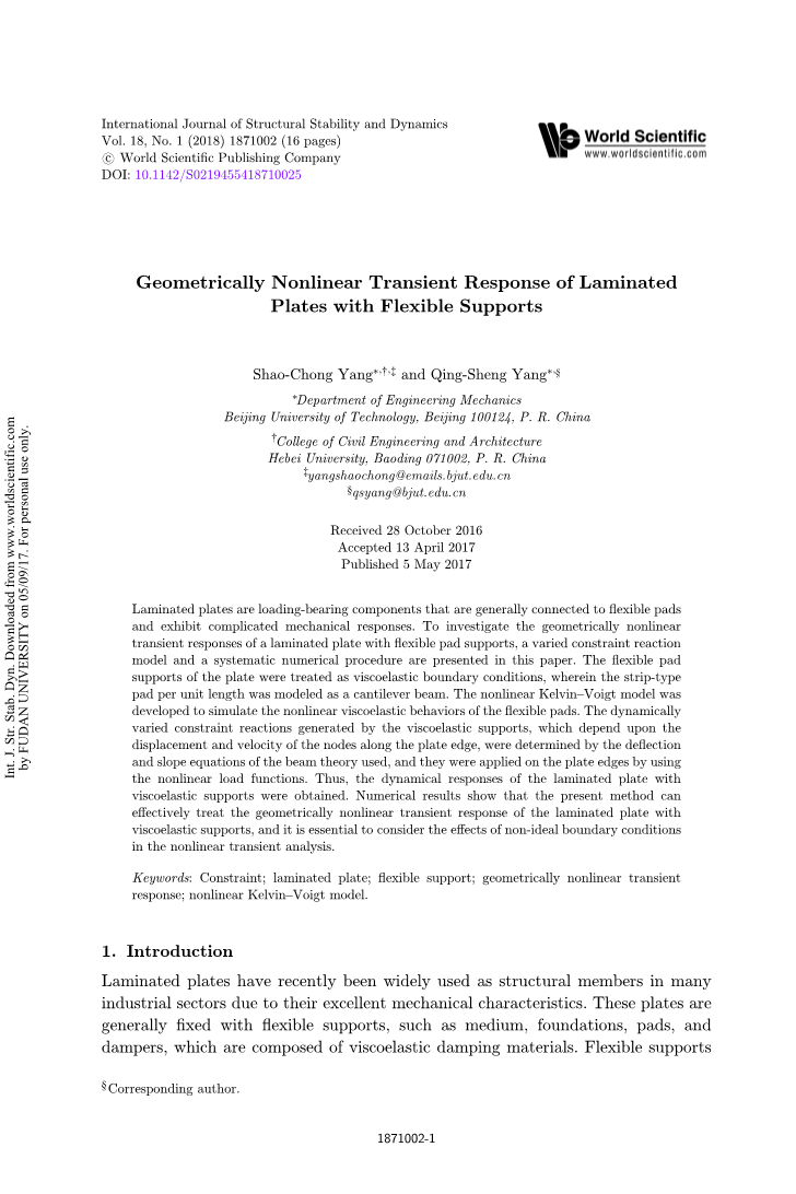 关键词:约束;层合板;弹性支撑;几何非线性瞬态响应;非线性Kelvin–Voigt模型。