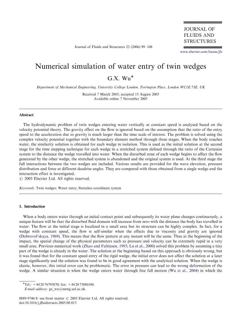 当结构体最初的接触点入水,随后水平面不断变化,将呈现出随着结构体入水被扰动的流体区域将会从零增加的特点。在最初的阶段流动被定为在很小的区域但是其构成十分复杂。事实上,对于单个锲形体定速入水,当忽略粘性以及重力的影响后流动是自相似的(Dobrovolskaya,1969)。这意味着在任意时刻的流动模式是相同的。因此在入水冲击的开始阶段,物理参数如压力以及速度将会在一个很小的区域产生急剧的变化。以前的数值工作(Zhao和Faltinsen,1993;Lu 等人,2000)通过假设锲形体微小的一部分已经在水中解决了这个问题。基于这种方法对于开始阶段显然是错误的,但是发现对于定速入水的刚性锲形体,最初的误差不会显著影响随后的阶段并且这种解决方案与理论分析解析解一致。然而,如果锲形体是塑性的,最初的误差可能会产生问题。压力的误差将会导致锲形体错误的变形。类似的情况是,锲形体自由落水(Wu 等人,2004)的加速度是未知的。压力的误差将会给出错误的加速度,错误的加速度导致给出错误的速度。这个错误的信息将会通过边界条件反馈到流动中,从而使最终的结果是误导性的。