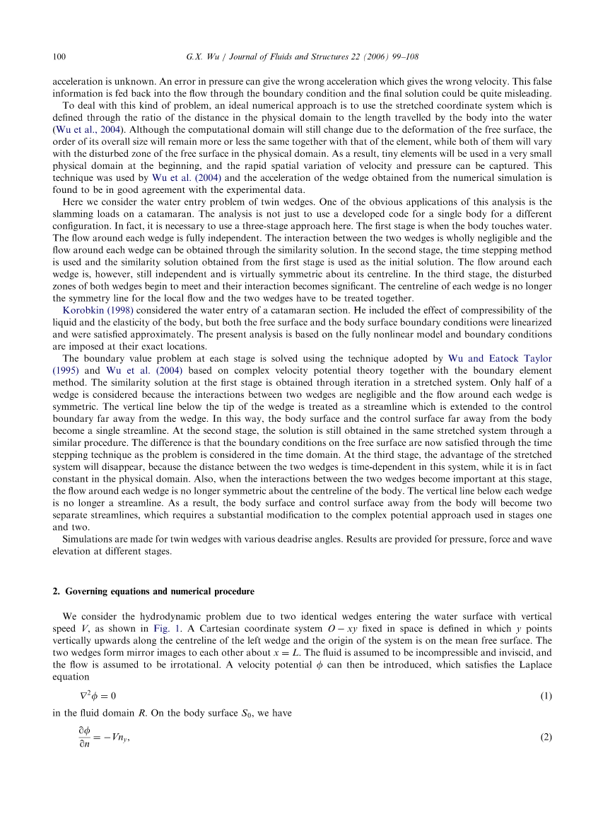 在每一个阶段的边界值问题则是采用1995年Wu和泰勒以及2004Wu等人基于边界元方法的复速度势理论来解决。第一阶段的自相似解法通过在拉伸坐标系进行迭代获得。仅考虑一个锲形体的一半,因为开始时忽略相互作用,绕每个锲形体的流动是对称的。锲形体尖端下方的垂直线被视为流线并且这条线延伸到远离锲形体的控制边界。在这种情况下,控制体表面和远离结构体的控制表面变成了一条流线。第二阶段,其解仍然在相同的拉伸坐标系下通过相似方法获得。其不同是现在的自由表面的边界条件是通过问题在时域考虑的时间步技术满足。在第三阶段,拉伸坐标系的优势将会消失,因为在这个坐标系中双锲形体的距离是依赖时间的,但是距离在物理模型中是恒定不变的。同时,当双锲形体之间的相互影响作用在这一阶段变得十分重要,每个锲形体周围的流动不再关于结构体的中心线对称。每个锲形体下方的垂直线不再是一条流线。作为结果,结构体表面和远离结构体的控制表面变成两个分散开的流线,这需要对第一以及第二阶段用到的复速度势方法做大量的修改。