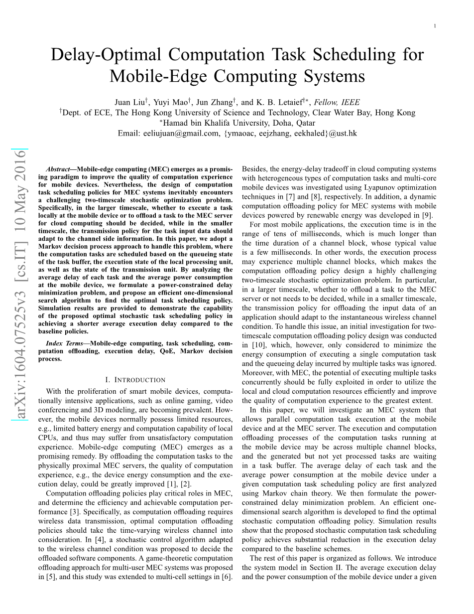摘要:移动边缘计算(MEC)作为一种新的技术应运而生,提高了移动设备的计算体验的质量。然而,MEC系统的计算任务调度策略的设计不可避免地遇到具有挑战性的双时间尺度随机优化问题。具体而言,在较大的时间范围内,在云计算中应确定是任务在移动设备本地执行还是将任务卸载到MEC服务器以进行计算,而在较小的时间范围内,任务输入数据的传输策略应适应于频道边信息。在本文中,我们采用马尔可夫决策过程方法来处理这个问题,其中计算任务是根据任务缓冲区的排队状态进行调度,即本地处理单元的状态,以及传输单元的状态。通过分析每个任务在移动设备上的平均延迟和平均功耗,我们制定了功率约束的延迟最小化问题,并提出了一种有效的一维搜索算法来寻找最优的任务调度策略。通过仿真结果可以证明所提出的最优随机任务调度策略与基线策略相比实现更短的平均执行延迟的能力。