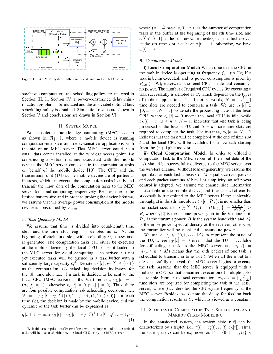 本文的其余部分组织如下。第二部分介绍了系统模型,平均执行延迟以及移动设备在给定计算卸载策略下的功耗队列状态数据队列处理单位分析了随机计算任务调度策略,在第三节和第四节中,提出了一个功率受限的延迟小-多目标优化问题,并给出了相应的优化任务得到调度策略。仿真结果在第五节,结论见第六节。