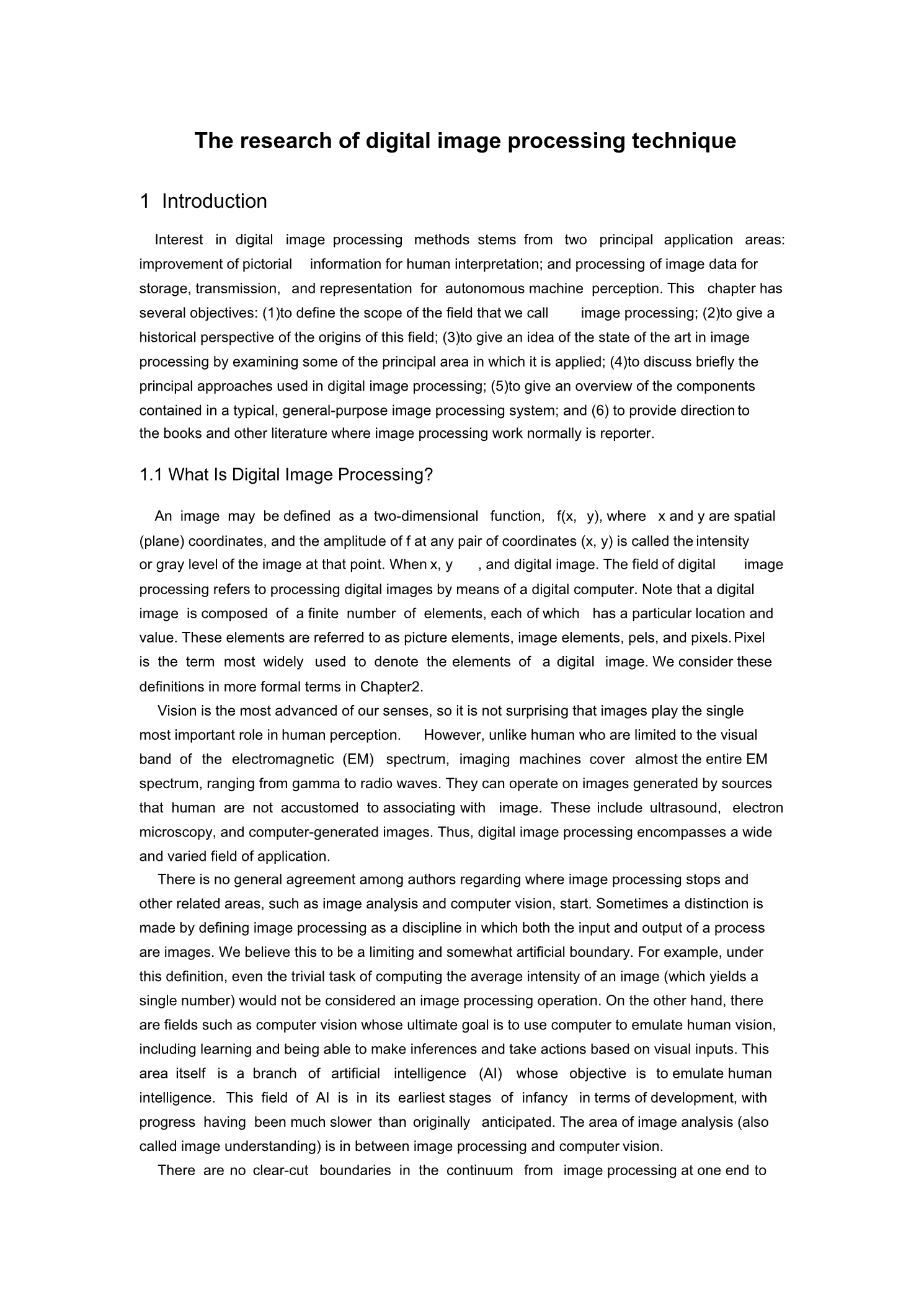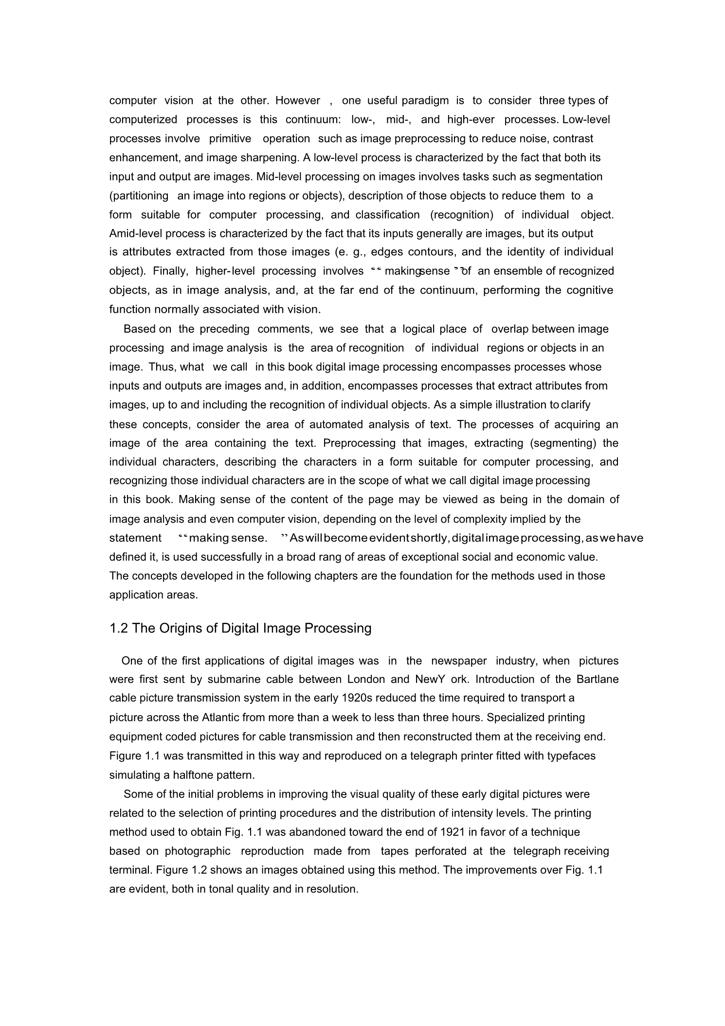 根据上述讨论,我们看到,图像处理和图像分析两个领域合乎逻辑的重叠区域是图像中特定区域或物体的识别这一领域。这样,在本书中,我们界定数字图像处理包括输入和输出均是图像的处理,同时也包括从图像中提取特征及识别特定物体的处理。举一个简单的文本自动分析方面的例子来具体说明这一概念。在自动分析文本时首先获取一幅包含文本的图像,对该图像进行预处理,提取(分割)字符,然后以适合计算机处理的形式描述这些字符,最后识别这些字符,而所有这些操作都在本书界定的数字图像处理的范围内。理解一页的内容可能要根据理解的复杂度从图像分析或计算机视觉领域考虑问题。这样,本书定义的数字图像处理的概念将在有特殊社会和经济价值的领域内通用。在以下各章展开的概念是那些应用领域所用方法的基础。
