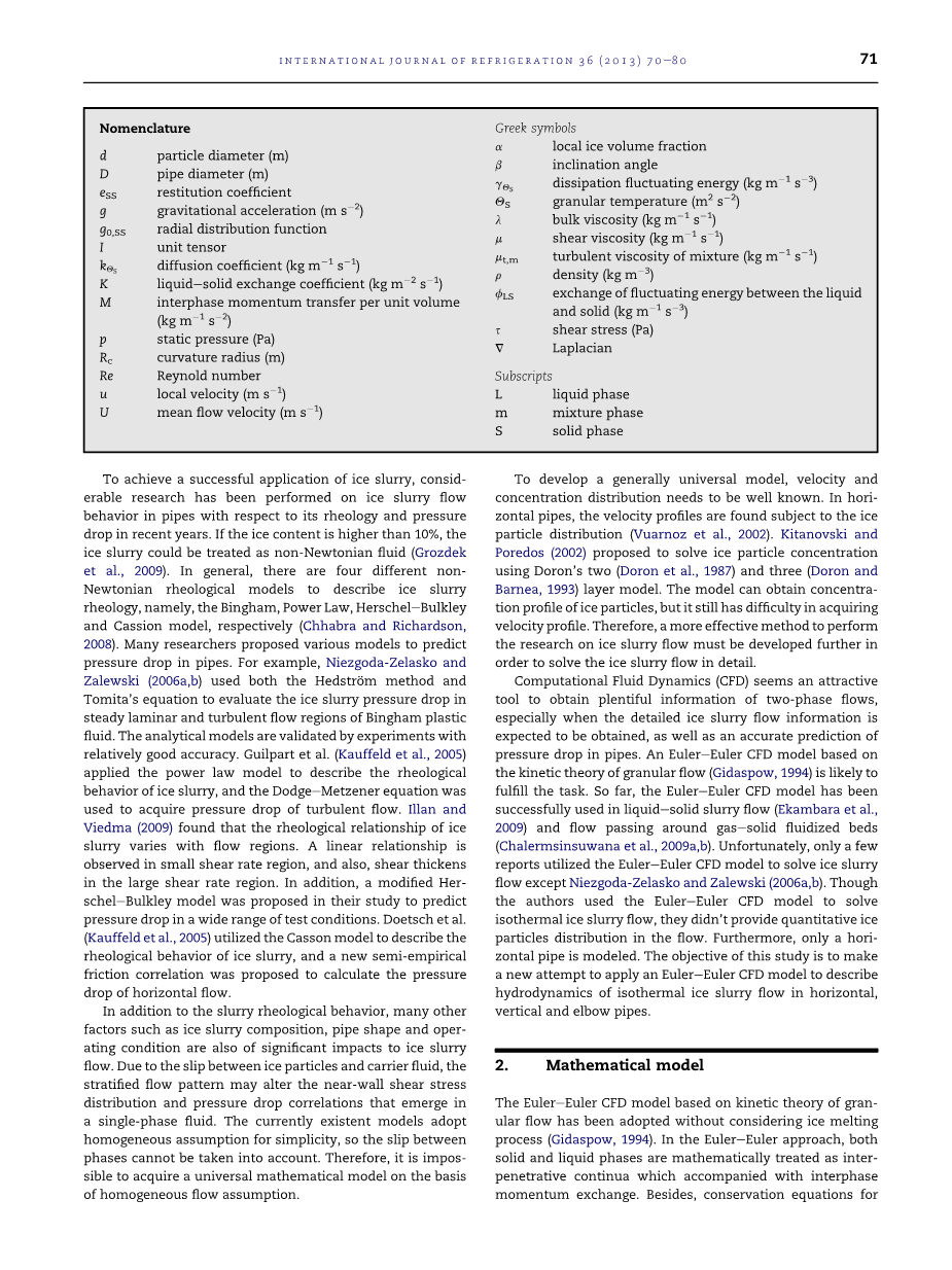 计算流体动力学(CFD)似乎是获得丰富的两相流量信息的有吸引力的工具,特别是在预计获得详细的冰浆流量信息时,以及对管道压降的准确预测。基于粒状流动力学理论的Euler-Euler CFD模型(Gidaspow,1994)很可能完成任务。到目前为止,Euler-Euler CFD模型已经成功地用于液体固体泥浆流(Ekambara等人,2009)和流过气体流化床的流动(Chalermsinsuwana等人,2009a,b)。不幸的是,除了Niezgoda-Zelasko和Zalewski(2006a,b)之外,只有少数报告利用Euler-Euler CFD模型来解决冰浆流。虽然作者使用Euler-Euler CFD模型来解决等温冰浆流,但它们在流量中没有提供定量的冰粒分布。此外,只有水平管道被建模。本研究的目的是尝试应用Euler-Euler CFD模型来描述水平,垂直和弯管中等温冰浆流动的流体动力学。