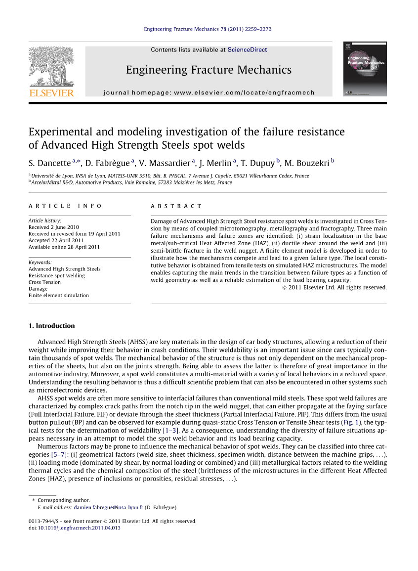 超高强钢(AHSS)是车身结构设计中的关键材料,使其在减轻重量的同时能在碰撞情况下有更好的表现。因为汽车通常有上千个点焊,所以它们的焊接性是一个重要的问题。所以,结构的机械性能不仅与板件的机械性质有关而且和街头强度有关。此外,点焊包含多材质的多种在诱导空间中的局部行为。因此,理解产生的行为是一个科学难题,这种难题也可以在诸如微电子设备的其他系统中遇到。