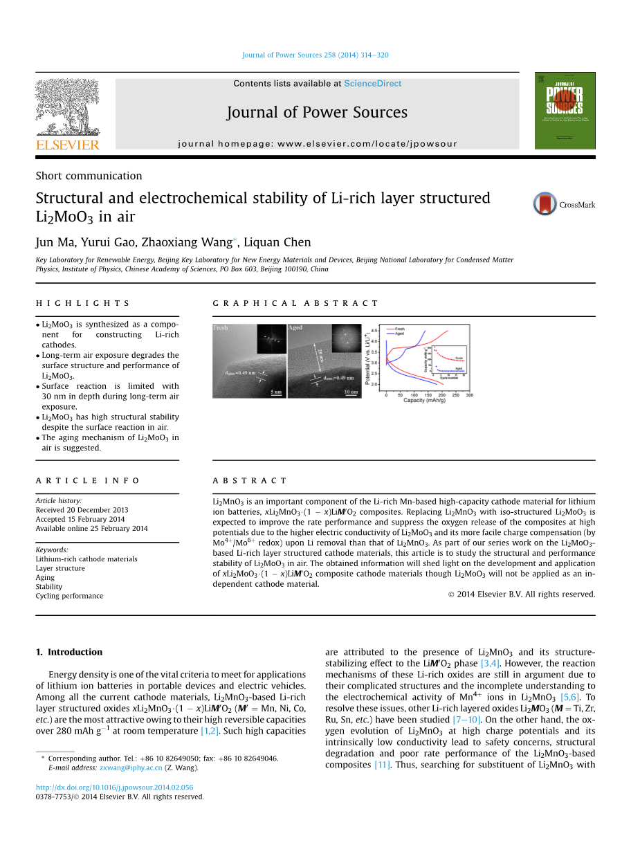 在本工作中,我们评估Li2MoO3在室温空气中结构和电化学稳定并且探索它衰老的机制。该研究将解释Li2MoO3富Li正极材料的发展和应用。虽然Li2MoO3本身将不作为一个独立的在实践中正极材料。