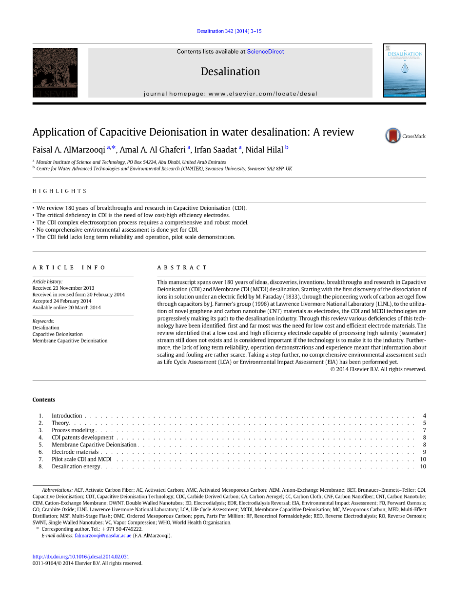 这篇文章记录了电容脱盐和薄膜电容脱盐技术在这180年来的创新、探索、发明、突破、以及研究。从M. Faraday首次发现溶液在电场作用下能实现去离子化(1833)到J. Farmer的研究组在Lawrence Livermore国家实验室实现利用新型石墨烯、碳气凝胶和碳纳米管材料作为电极材料去进行电容脱盐这一创举(1996)这一个世纪里,电容脱盐和薄膜电容脱盐技术正被逐步利用于海水淡化这一工作中。然而这项技术却仍然有着各种各样的缺陷,其中最为重要的莫过于电容脱盐对低成本和高效能电极材料的需求。目前报道表明,现在还不存在处理高盐度的海水流的低成本以及高效能的电极材料,而且报道认为当下之急的是该项技术发展是否能赶上现代工业发展的脚步。此外缺乏长期可靠的操作演示和经验意味着这项技术的信息扩展和实际污染样本相当稀缺。退一步说,此前并没有类似综合环境评估等生命周期评估或环境影响评估完成的先例。