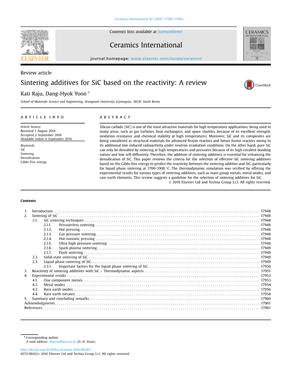 摘要:碳化硅是一种高温应用材料,由于其在高温下表现出的良好的强度抗氧化能力和化学稳定性被应用于很多方面,例如燃气轮机,热交换机和航天飞机。一方面,碳化硅及其合成物由于其在中子辐照条件下的低诱导放射性被认为是裂变反应堆和聚变反应堆的良好结构材料。另一方面,由于纯的碳化硅共价键力强和低自扩散性,其只能在高温高压下被烧结致密。因此,烧结添加剂的添加对于提高碳化硅的烧结来说是至关重要的。这篇论文主要是来评估挑选碳化硅有效的烧结添加剂的标准,基于吉布斯自由能来预测碳化硅和添加剂尤其是在1700℃到1900℃时的反应活性。本次热力学模拟将由提供各种添加剂的实验数据来证明,这些添加剂包括主要的族金属,金属氧化物以及稀土元素。本论文建议读者一本关于碳化硅烧结添加剂的书。