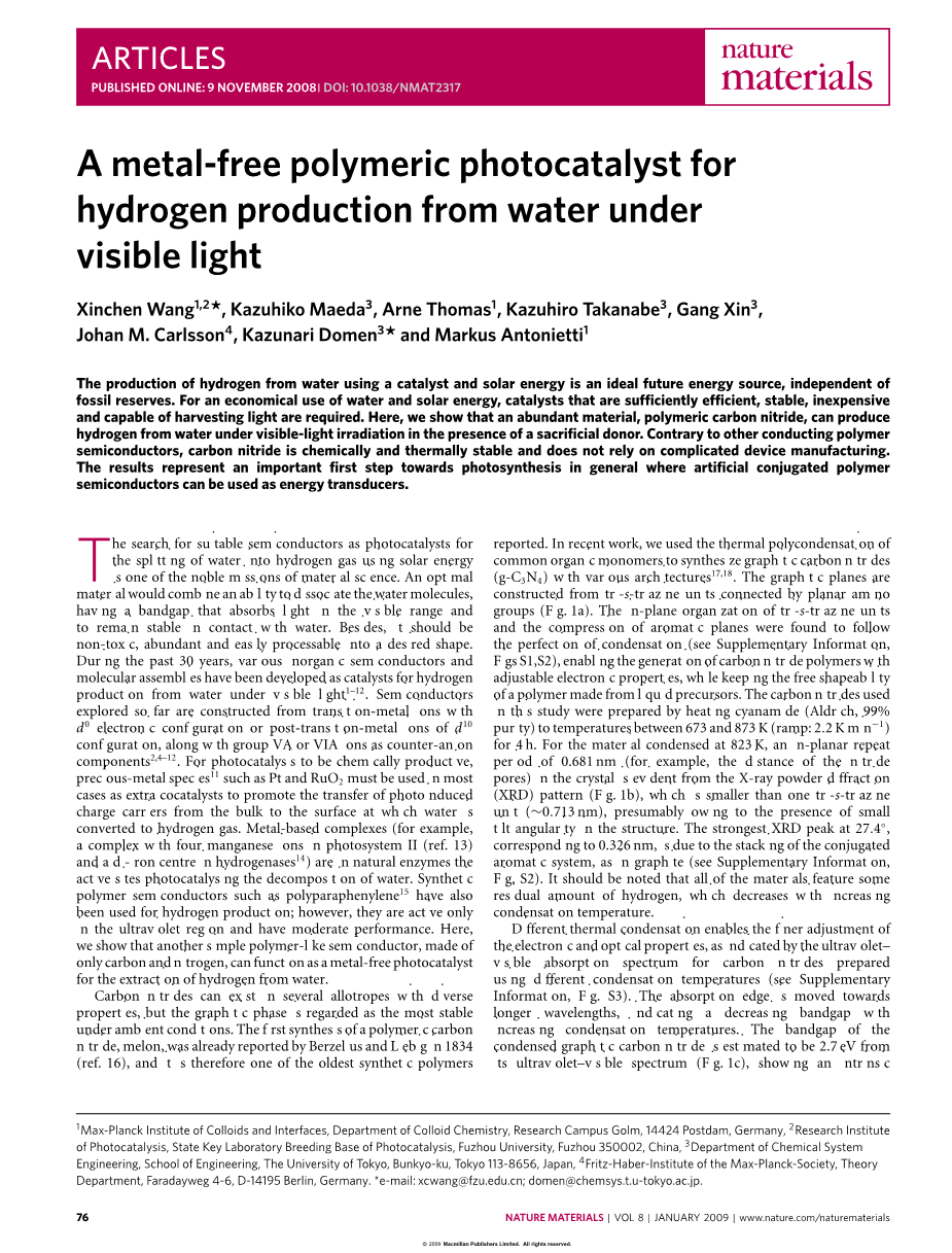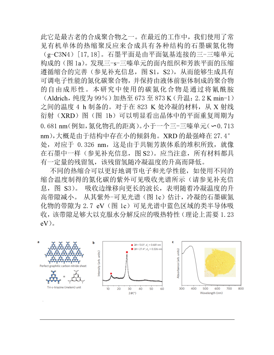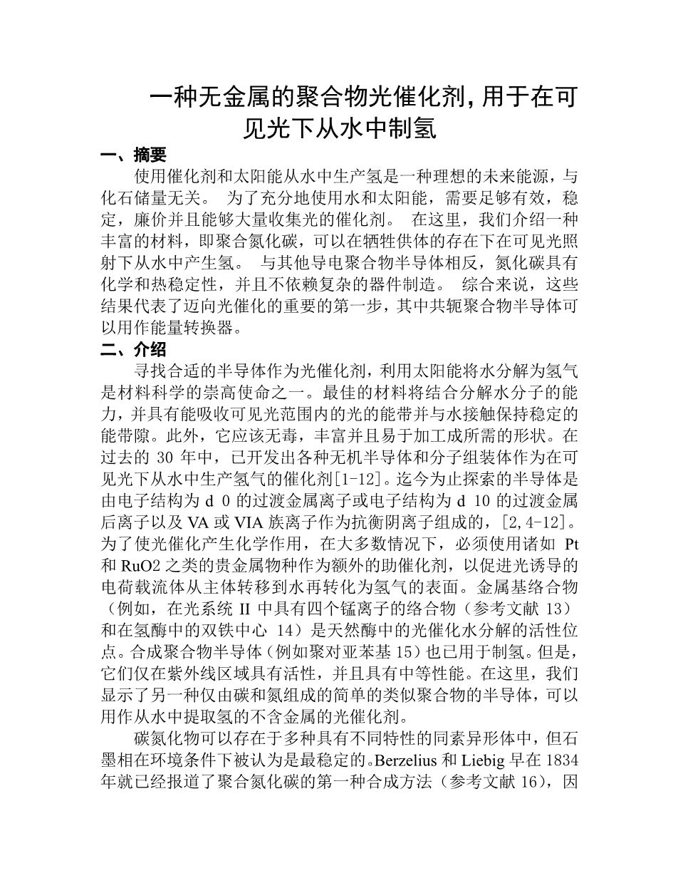 一种无金属的聚合物光催化剂,用于在可 见光下从水中制氢外文翻译资料