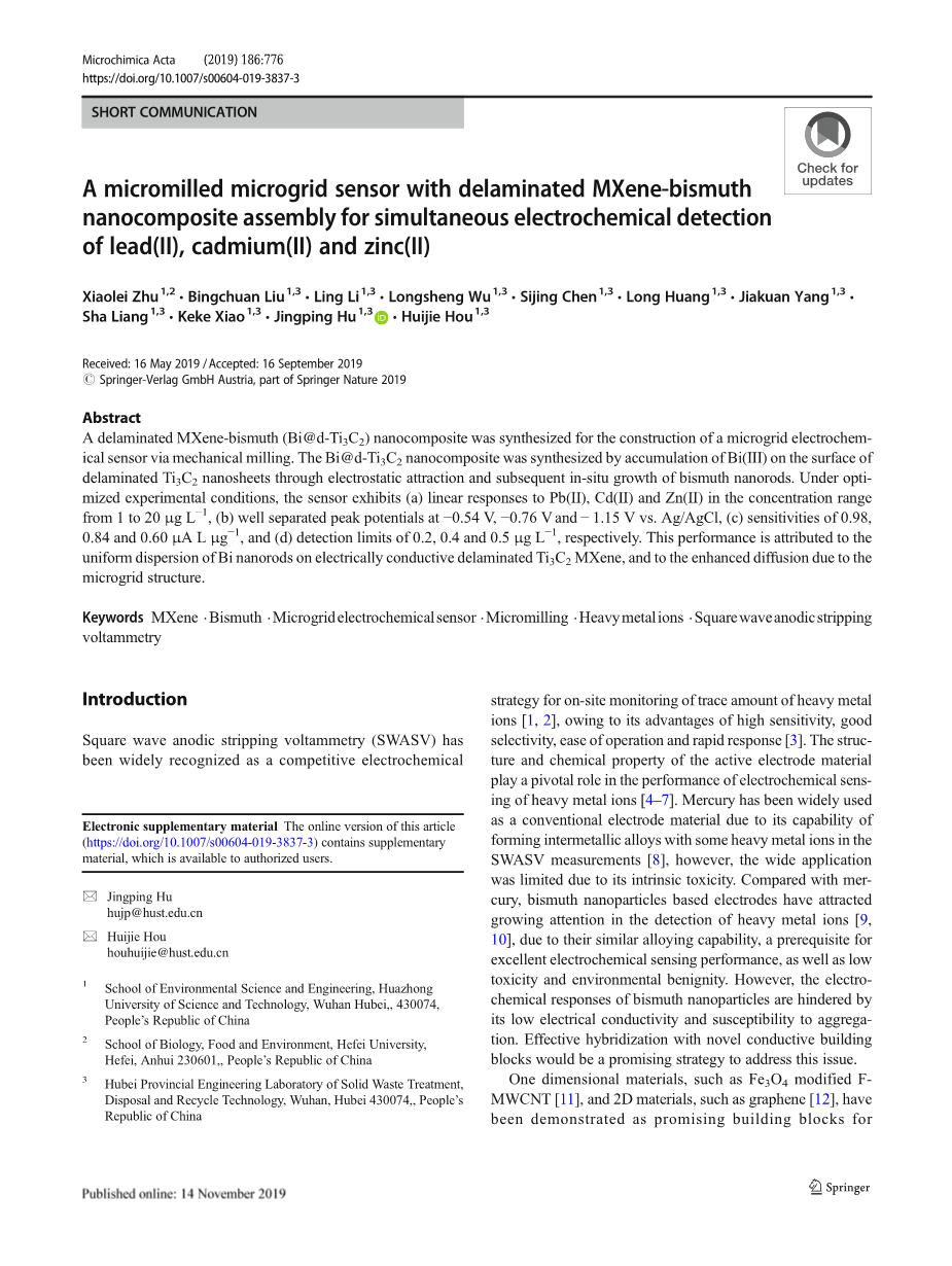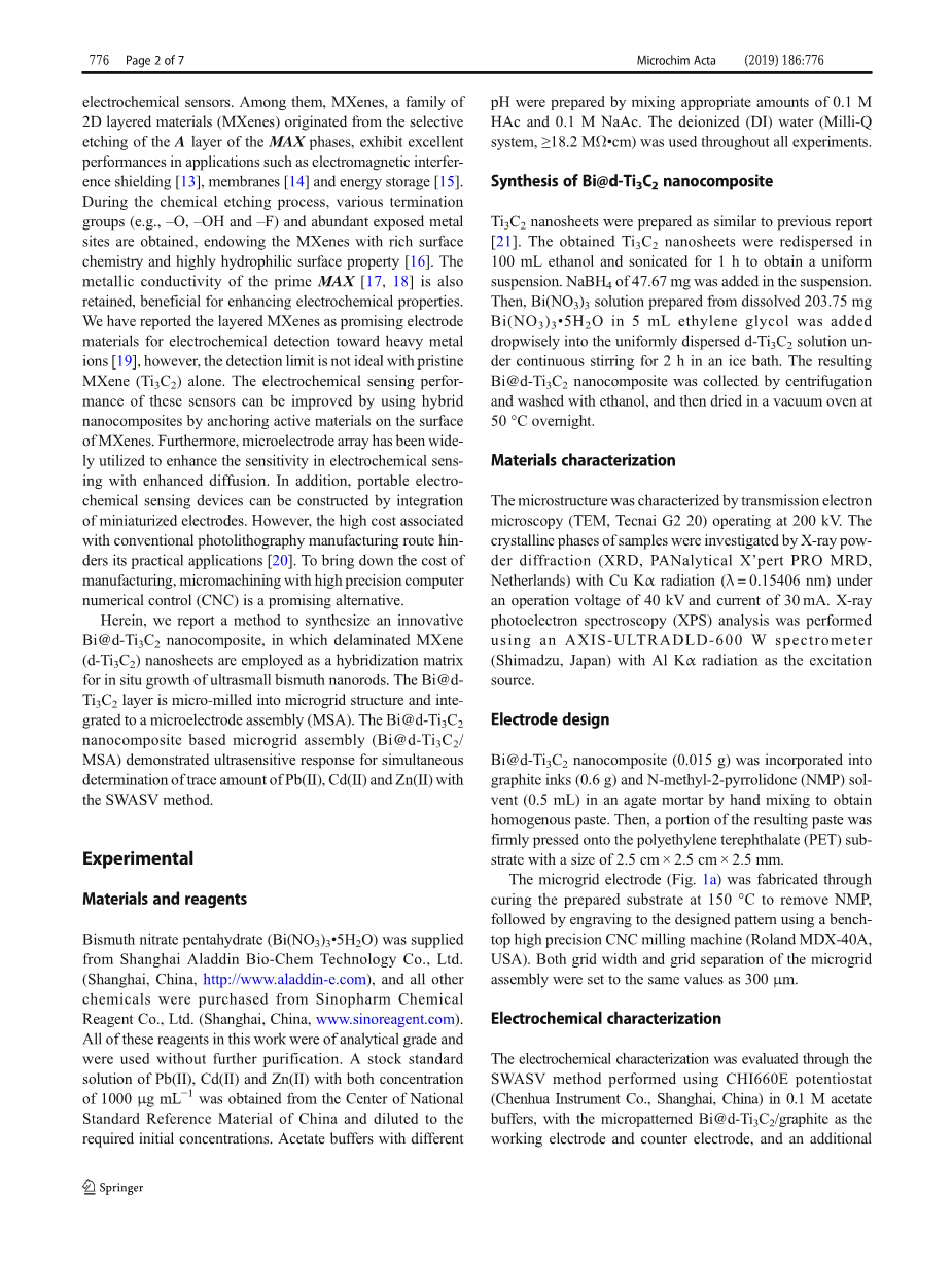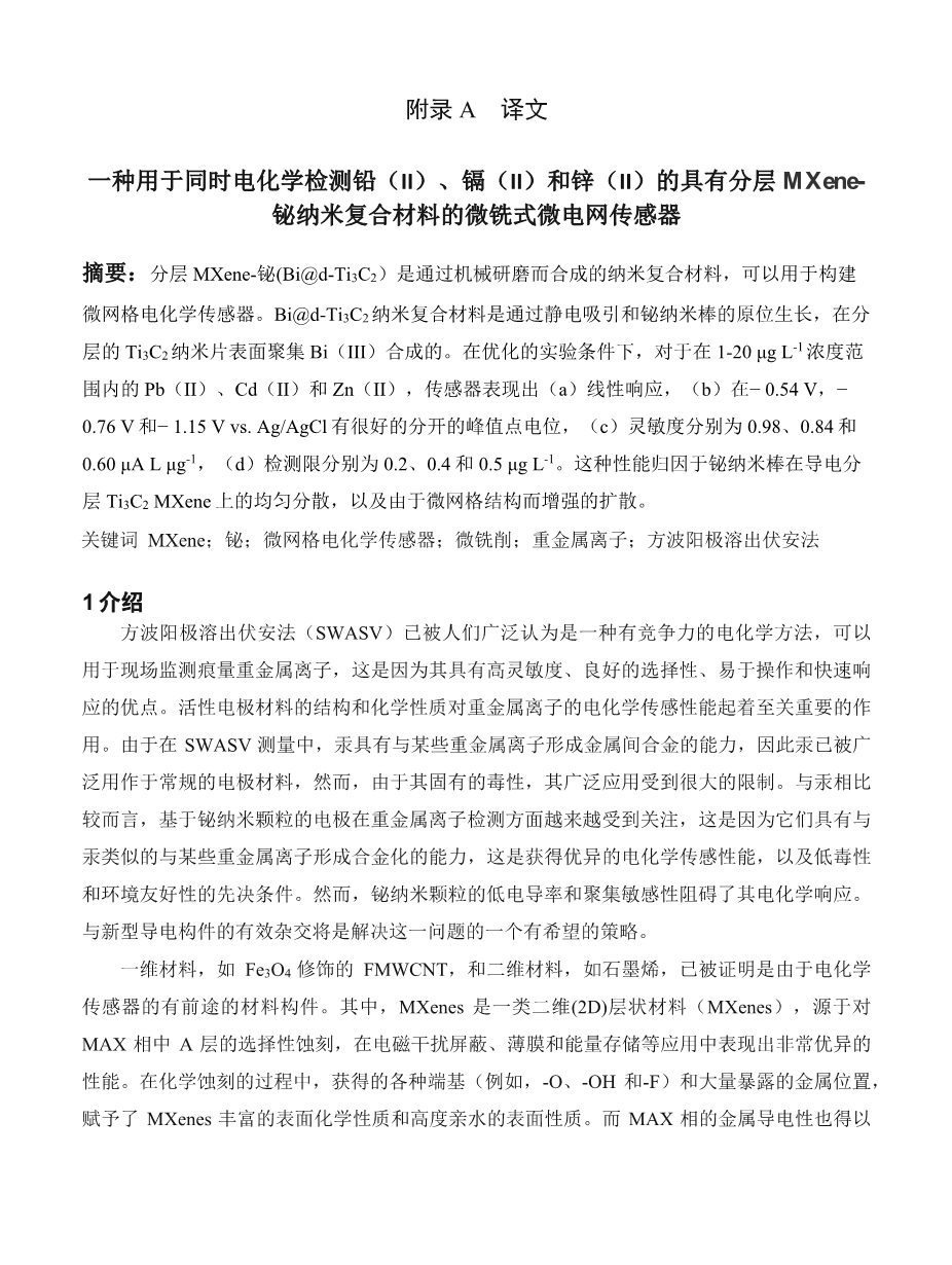 一种用于同时电化学检测铅(II)、镉(II)和锌(II)的具有分层MXene-铋纳米复合材料的微铣式微电网传感器外文翻译资料