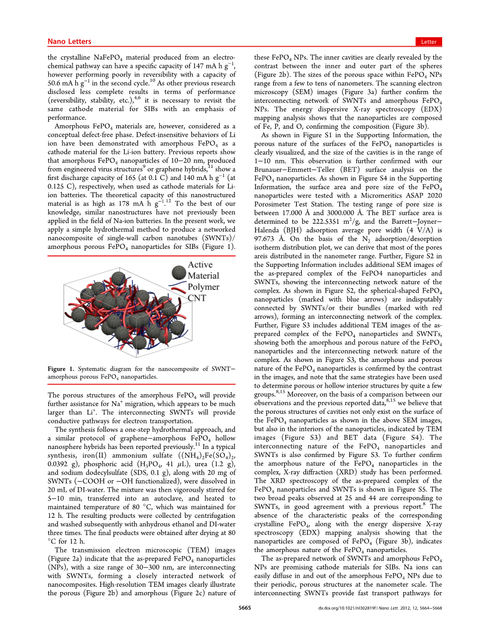 制备的纳米碳管网络和非晶FePO4纳米碳管是一种很有前景的钠离子电池正极材料。钠离子在纳米尺度上具有周期性的多孔结构,可以很容易地在非晶态FePO4纳米颗粒中扩散。相互连接的单壁碳纳米管提供了快速的电子传输途径,在单个多孔FePO4纳米颗粒之间提供了有效的传输。因此,这些纳米复合材料有望通过改善钠离子和电子的传输来显著提高电池性能。此外,FePO4纳米颗粒的粗糙表面提供了活性材料(FePO4)与电解质之间更大的接触面积。在目前的合成工艺中,多壁碳纳米管或石墨烯可用于制备相应的非晶FePO4和碳基材料的纳米复合材料,与单壁碳纳米管相比,其成本要低得多。