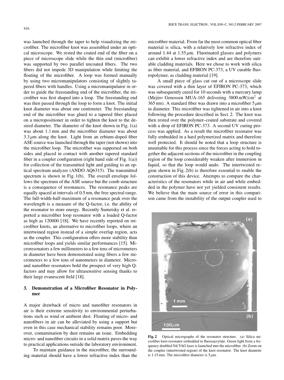 从显微镜载玻片上剪取一小片玻璃,涂覆上一层EFIRON PC-373,接着在汞灯下照射10s(Mejiro Genossen MUA_165在365nm处可传递3800mW/cm2的能量)。一根标准的光纤可拉伸为直径5mu;m的微米光纤。将微米光纤在空气中打结的具体过程在第二部分有描述。接着,将光纤结用聚合物基质进行固定,并用一滴EFIRON PC-373封装,再经过一秒的紫外固化处理。最终微型纤维谐振腔就可以被完全的封装在坚硬的聚合物中,得到很好的保护。需要注意的是,环形结构并不适用这个过程,当纤维被侵入在水中时,在力的作用下微型纤维相邻的部分相互吸引,耦合区域在很大程度上被削弱,使得环不能够保持。图2(b)所示的绞合部分是获得谐振器必不可少的结构。我们尝试比较空气与有机物封装两种条件下谐振器的特性,却得不到一致的结果。造成这种错误的主要原因可能来自耦合器输出时用于谐振腔传输到光学光谱分析仪能量的不稳定性。