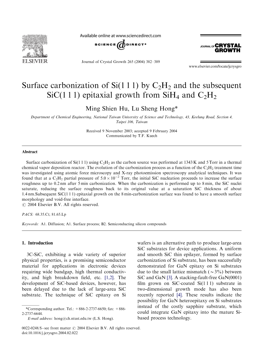 过去近十年硅基外延生长3C-SiC薄膜因为存在较大的的晶格失配(约20%)和热膨胀系数的不同(约8%)并没有取得大的进展。由Si表面碳化所形成的SiC缓冲层可以有效的解决之后SiC的失配问题。之前的研究中,Si表面碳化使用C3H8在1673K进行实验。然而在这种高温环境下引起的Si原子的外扩散会大大降低硅晶表面光洁度,意味着之后的外延生长碳化硅性能欠佳。之所以需要这么高的碳化温度是因为C3H8的低化学反应活性导致的。追求碳源低的分解温度是目前Si/SiC外延生长领域的热点之一。