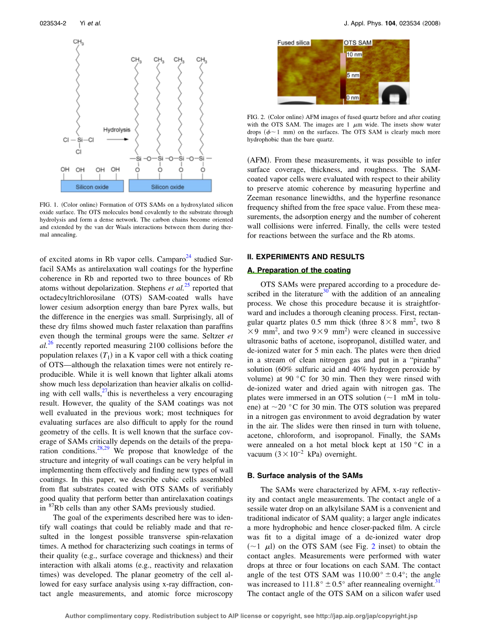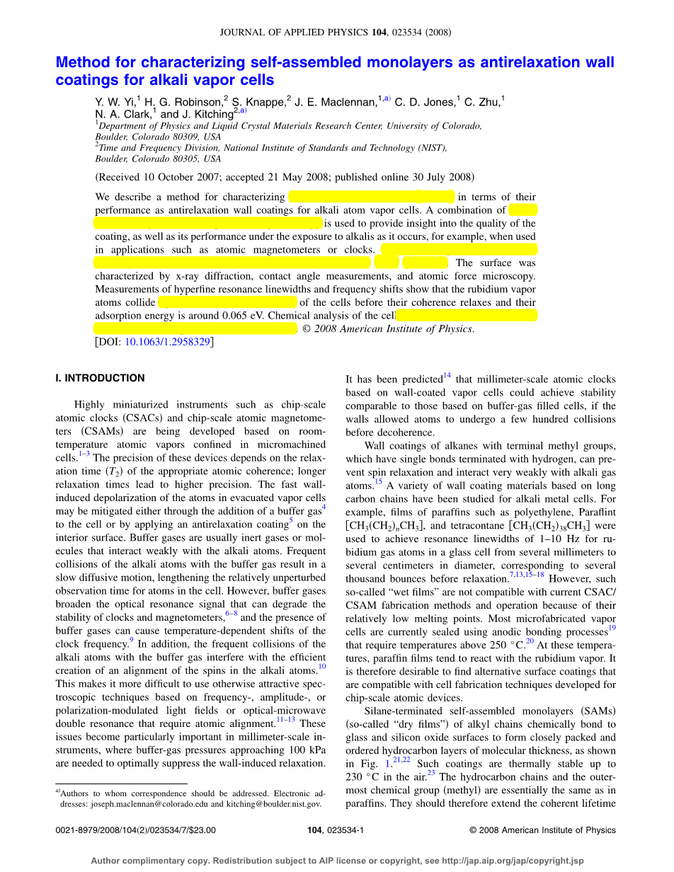 本文描述了一种表征自组装单分子膜SAMS作为碱金属原子蒸气腔室涂层抗弛豫性能的方法。例如,在原子磁力仪或原子钟的应用中,用初步表面分析和随后激光光谱相组合的方法来观察涂层的质量,以及它暴露在碱金属蒸气下所发生的变化。涂覆有十八烷基三氯硅烷自组装单分子膜的二氧化硅板被用于制作87Rb立方体气体腔室。样品表面特性通过X-射线衍射、接触角测量和原子力显微镜来描述。超精细磁共振线宽和频率偏移测量显示,在铷蒸气原子与腔室壁面相干性弛豫前,碰撞高达40次,它们的吸附能量大约是0.065伏特。对腔室的化学分析表明腔室涂层和铷原子之间发生了一些弱的反应。