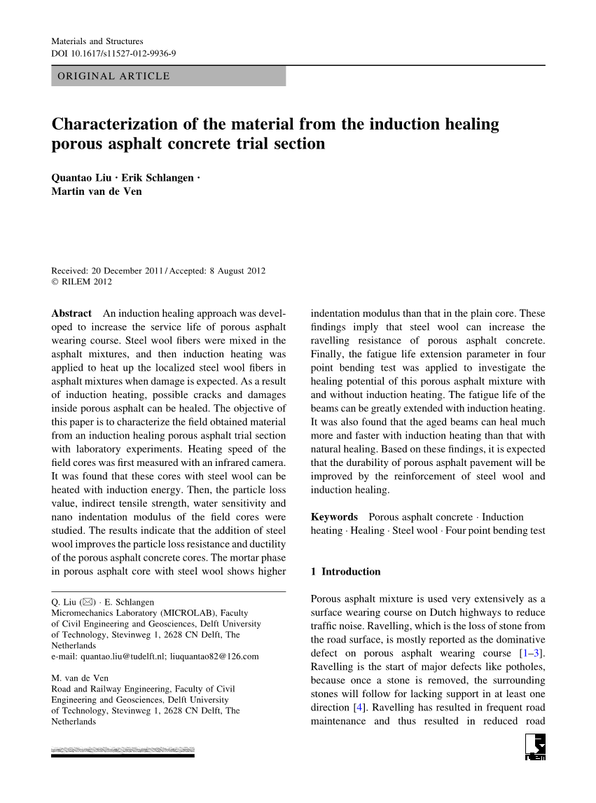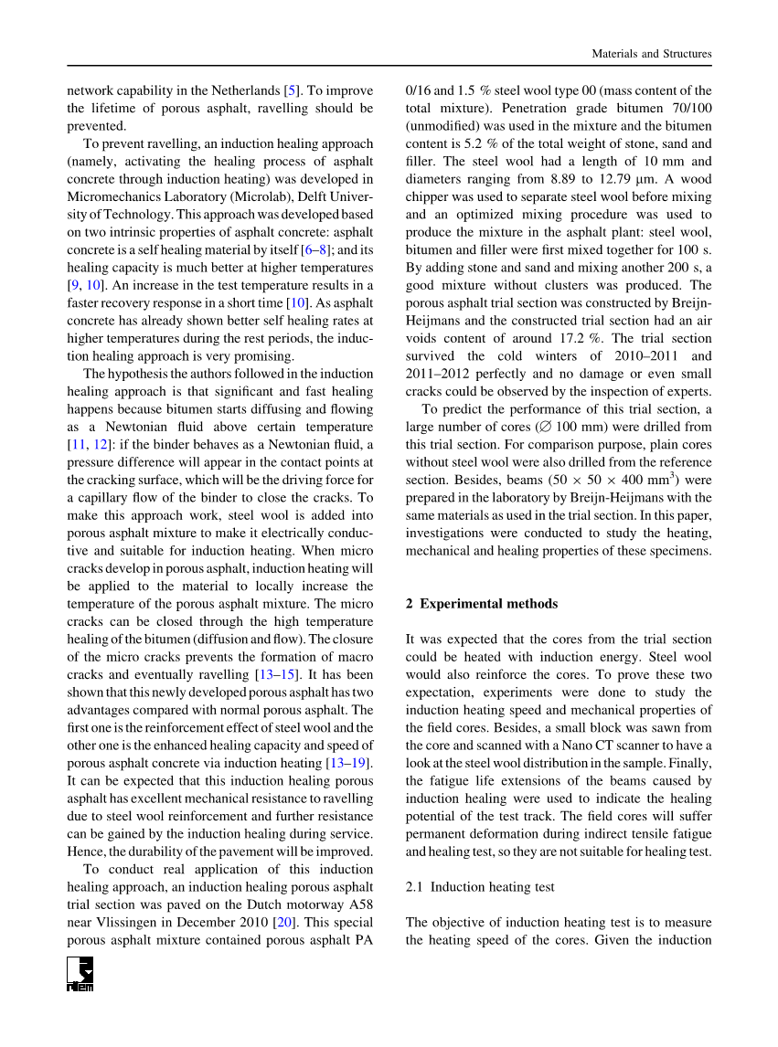 为了防止脱散,一种感应愈合方法(即通过感应加热活化沥青混凝土的愈合过程)在Delft 理工大学的Micromechanics实验室开发。这种方法是基于沥青混凝土的双特性:沥青混凝土是一种能通过自身自行愈合的材料[6–8]; 在更高的温度下,它的愈合能力要好得多[9, 10]. 在很短的时间,测试温度导致较快的恢复响应的增加[10]。正如沥青混凝土在休息期间,在较高温度下已经表现出较好的自愈率,诱导愈合的方法是非常有前途的。
