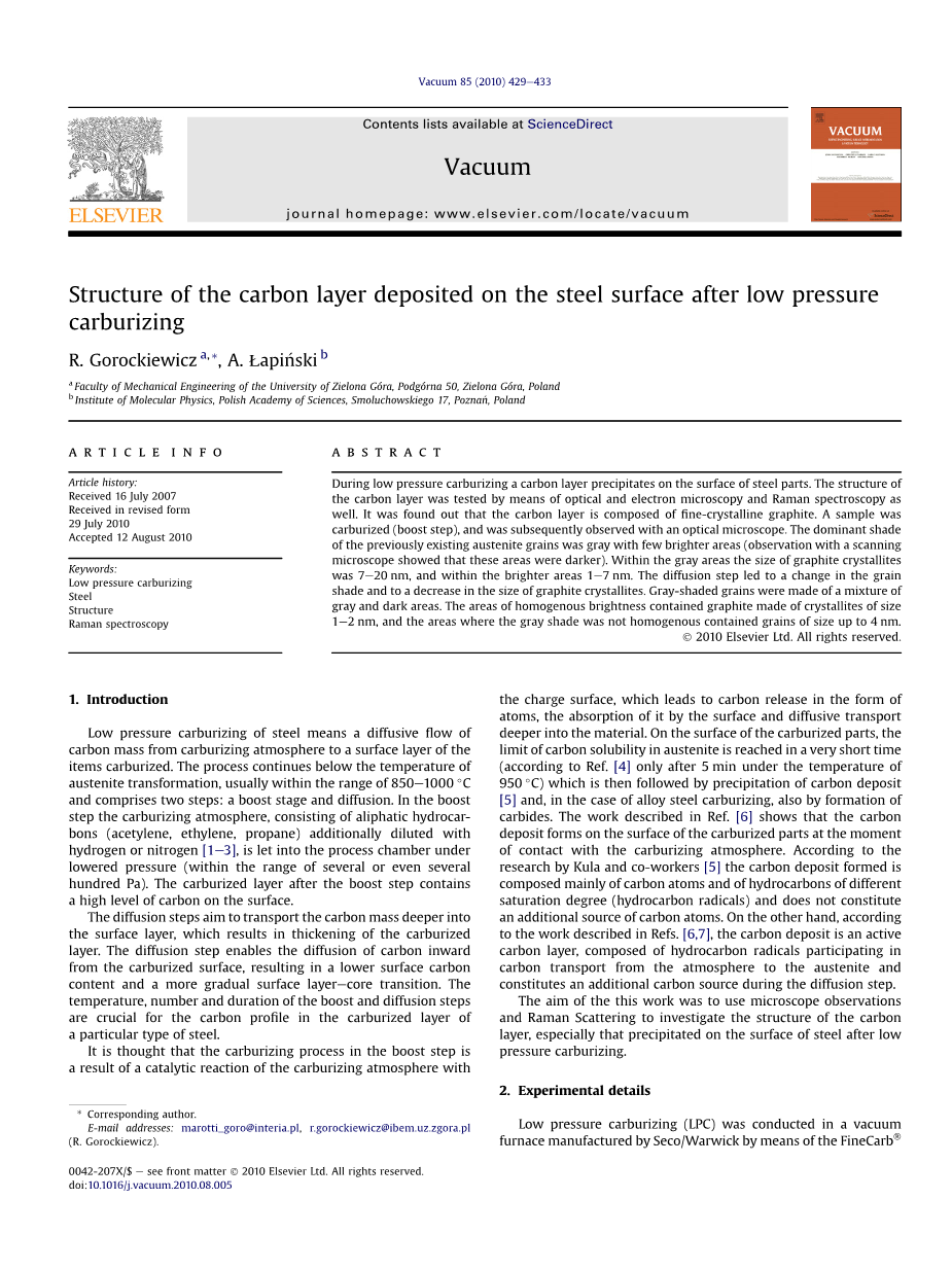 这项工作的目的是使用显微镜观察和拉曼散射研究碳层的结构,特别是在低压力渗碳时碳在钢表面上的沉淀。
