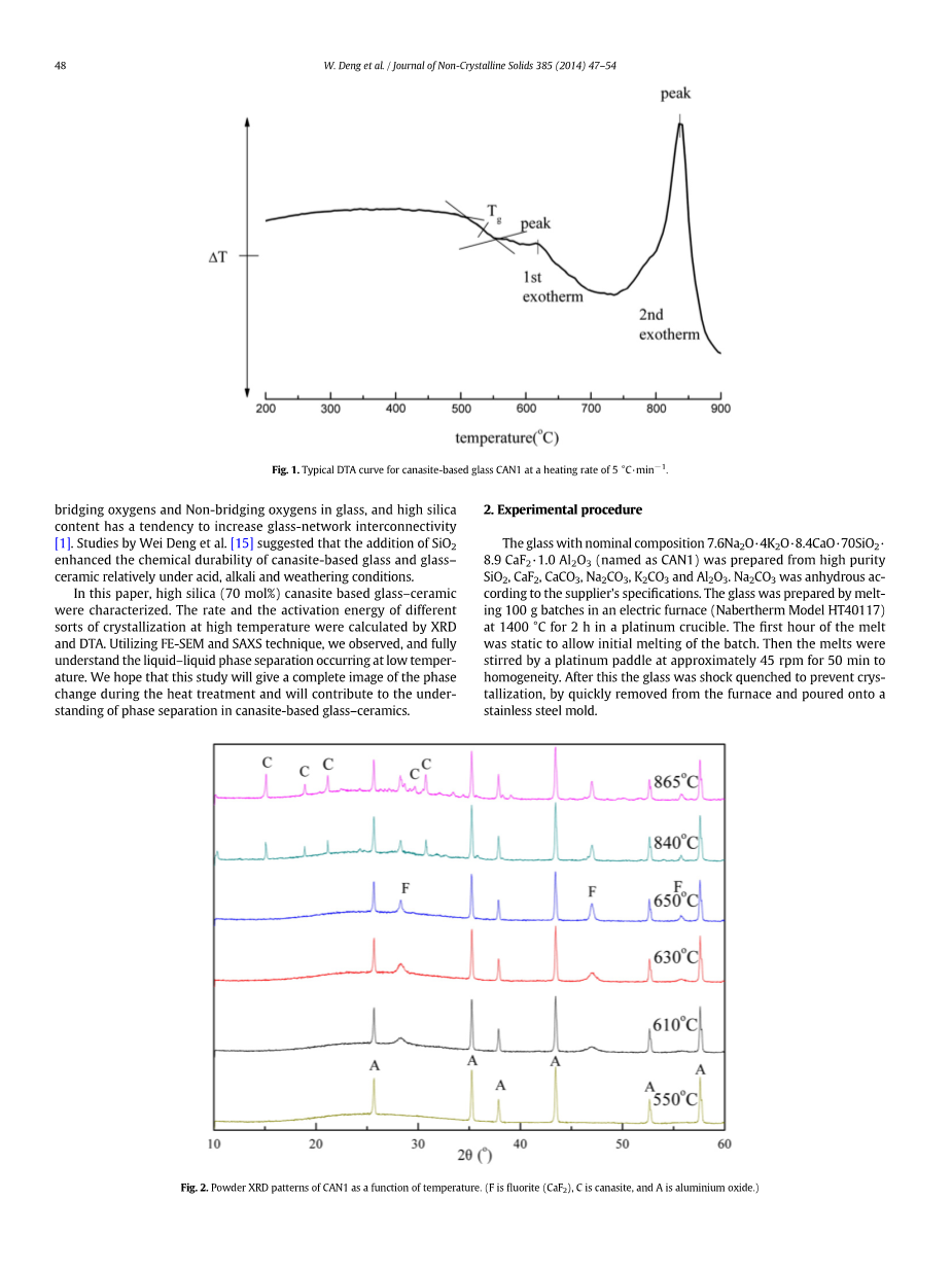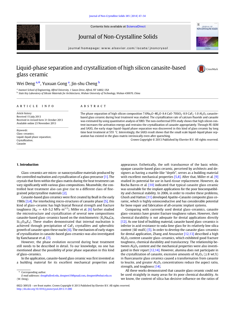 摘要:本文对高硅成分为7.6Na2O·4K2O·8.4CaO·70SiO2·8.9 CaF2·1.0 Al2O3 的以硅碱钙石为基础的微晶玻璃,在热处理过程中的相分离进行了研究。对氟化钙和硅碱钙石的结晶速率是利用X射线衍射定量分析方法进行了估算。非等温DTA(差热分析)分析表明,高含量的硅会增加活化能并且适当地控制硅碱钙石的结晶。在555 ℃对这种微晶玻璃进行长时间的热处理,通过FE-SEM (扫描电子显微镜)和SAXS(X射线小角度散射)发现了早期的液相分离。有趣的是,SAXS(X射线小角散射)实验结果表明,从本质上讲,即使在淬火后,小规模液相分离也是在这种玻璃基质中存在的。
