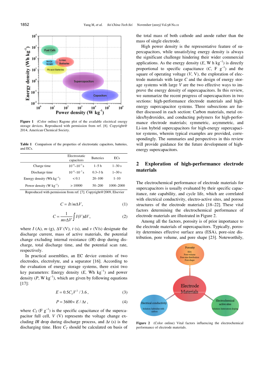 表 1 静电电容器、电池和电化学电容器的性能比较。