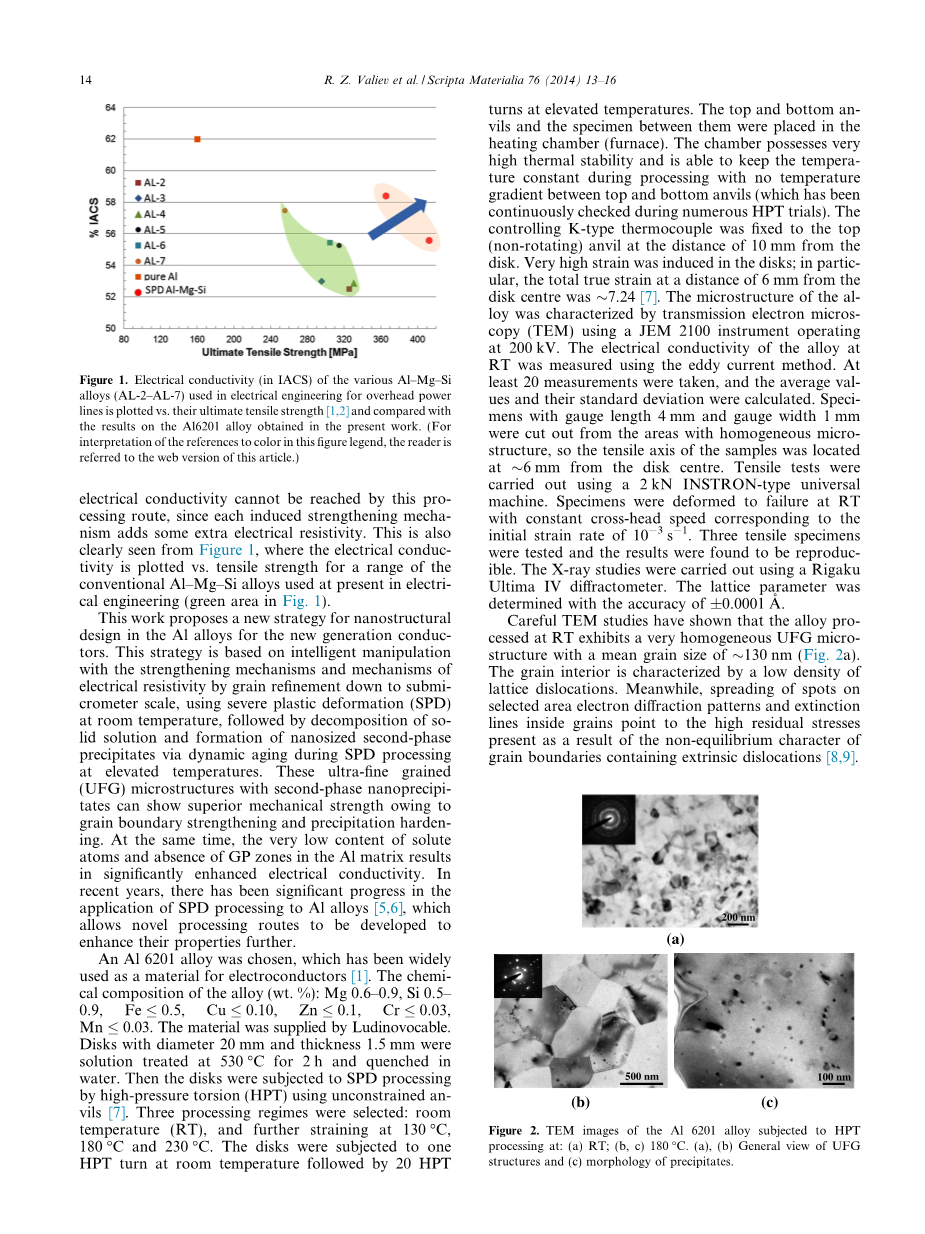 经HPT处理的6201铝合金的电导率和力学性能的数据也列在表1。在室温下经HPT处理的铝合金的强度出现了不同程度的增加,极限抗拉强度超过了500 MPa,但这个温度下的电导率却很低,只有47.7%(IACS)。然而,在不断提高的温度下经过HPT加工的材料的电导率却显著增加,例如在230℃下经过HPT处理的电导率接近纯铝的59% IACS(表1),而拉伸强度仍然很高。经过130℃和180℃处理的合金都很好地结合了高强度和高导电性,测得强度和电导率的值列在了表1。在这些铝合金中,这种高强度和高电导率的组合看起来是独特又不寻常的(图1)。