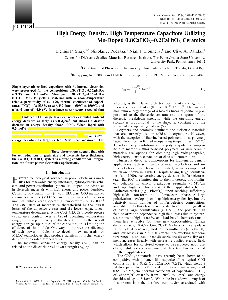 Mn掺杂0.8CaTiO3–0.2CaHfO3陶瓷材料高能量密度,耐高温电容器外文翻译资料