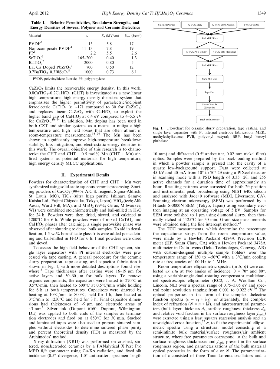 最近的研究显示C0G型材料可与聚合物薄膜电容器相媲美[9]。一款典型的C0G材料的成分是0.8CaZrO3–0.2CaTiO3 (CZT),其相对介电常数为εr~34-75,击穿强度为0.65–1.75 MV/cm,电容的热系数为30 ppm/°C或者0.5%(-50℃-125℃),并且能量密度上升到5 J/cm3[9]。尽管这个体系的击穿强度很高,但因CaZrO3导致的低介电常数限制了可恢复能量密度。在本次研究中,0.8CaTiO3–0.2CaHfO3 (CHT)被用作一个新的线性高温高能量密度的介电体系,该体系凸显了顺电性/初期的铁电体CaTiO3材料更高的介电常数(与介电常数为30的CaZrO3相比其介电常数达171),并且用CaHfO3代替线性CaZrO3充分利用了在6.4eV下与4-5.5eV下CaZrO3相比 CaHfO3更宽的带隙[10-14]。另外,Mn掺杂用于CZT及类似体系是一种减少在常温测试中通常不存在的高温高场损耗的方法[14-24]。在本研究中,掺杂的Mn已显示能极大提高高温击穿稳定性,减少损耗,以及提高静电能量密度。本研究的全部目标在于展现CHT和0.5 mol% Mn掺杂的CHT (CHT Mn)空气煅烧体系作为一种在高温高能量密度MLCC应用领域中具有极大潜力的材料的特点。