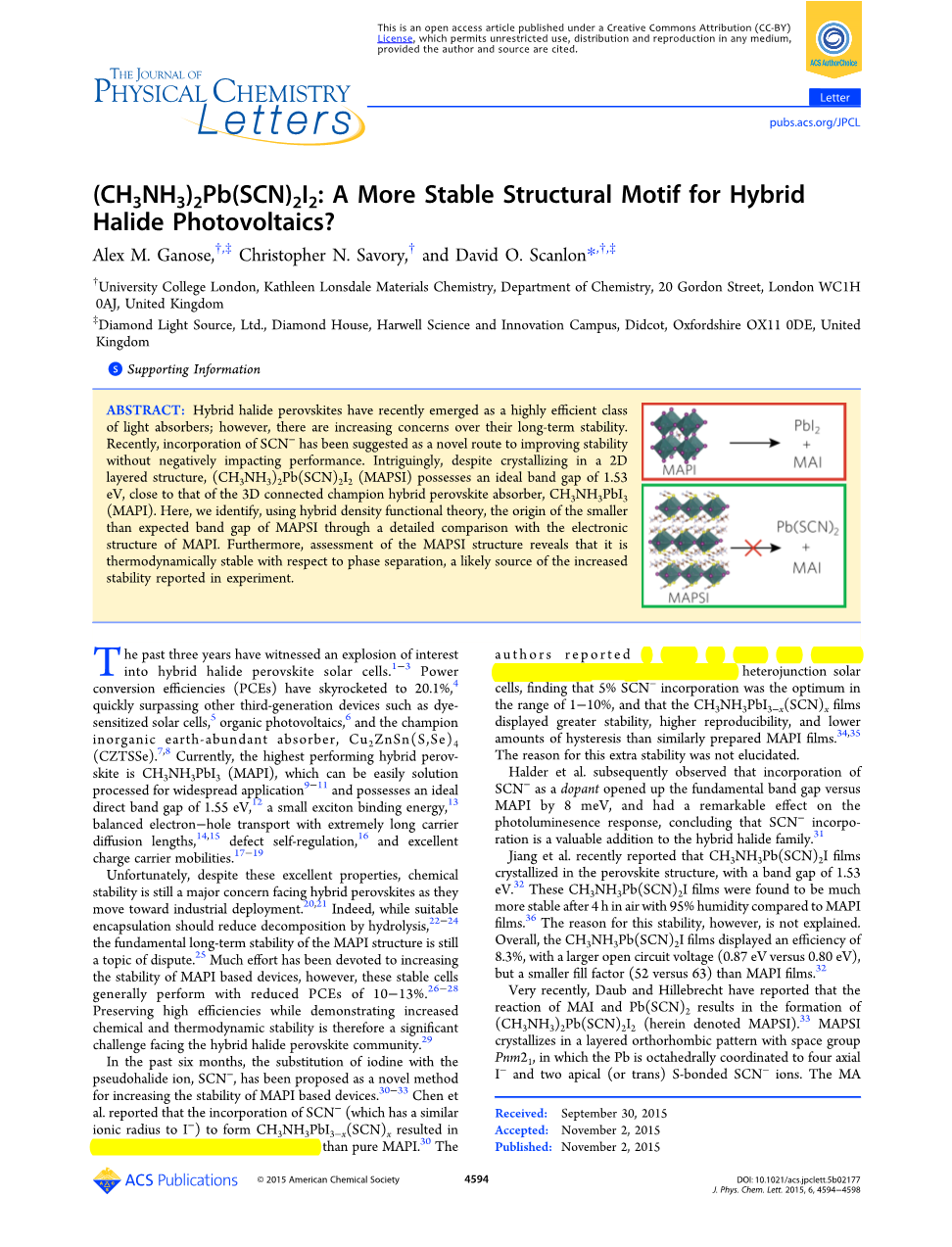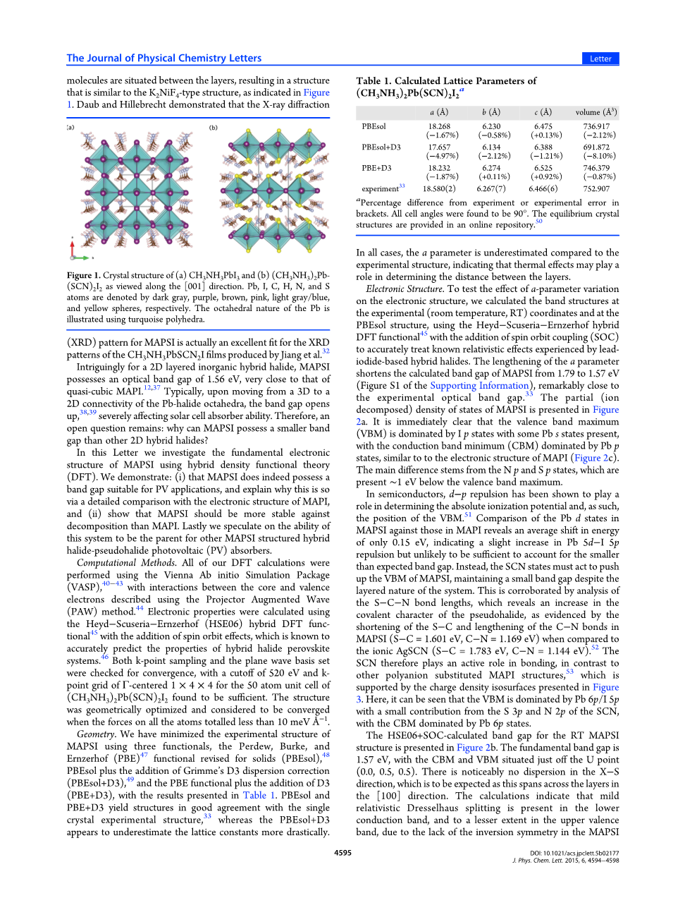 混合卤化物钙钛矿太阳能电池最近展现出其高效光吸收能力的一面;然而,最近的研究更注重他的长期稳定性。最近,向混合卤化物钙钛矿太阳能电池中掺入SCN-离子被建议是一种没有负面影响且提高稳定性的方法。有趣的是,尽管(CH3NH3)2Pb(SCN)2I2即(MAPSI)是一种以二维层状结构结晶的晶体,但它仍然具有1.53eV的理想带隙,和理想的三维结构钙钛矿CH3NH3PbI3(MAPI)结构接近。在这篇文章里,我们采用混合密度泛函理论通过比对MAPI和MAPSI的电子结构来确定MAPSI的带隙比预期小的原因。此外,通过估测MAPSI结构来揭示其热力学稳定相对于相分离,一种在实验里被报导可能增加稳定性的源。