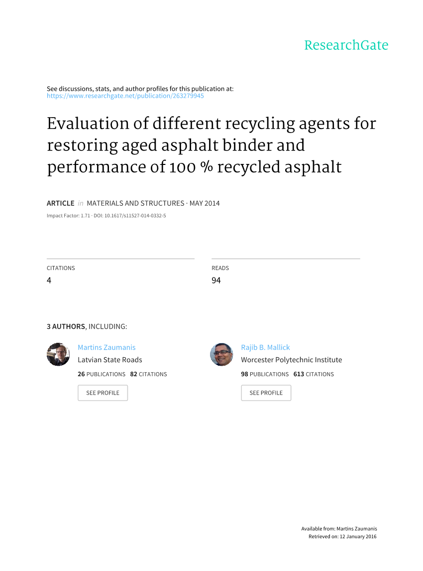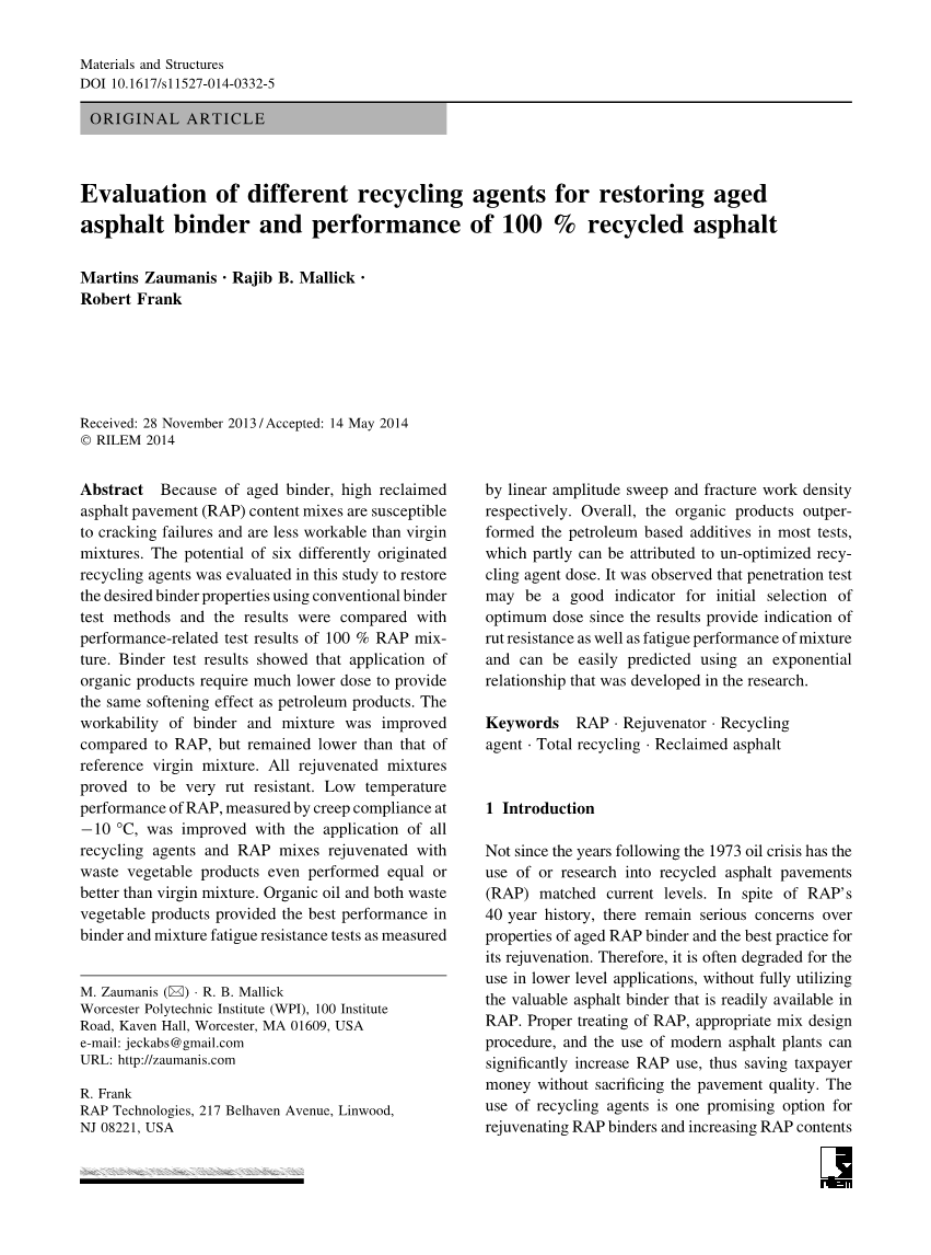 课题的客观目的是评价再生剂对恢复老化RAP粘合剂和对100%回收的热沥青混合料相关性能的评价