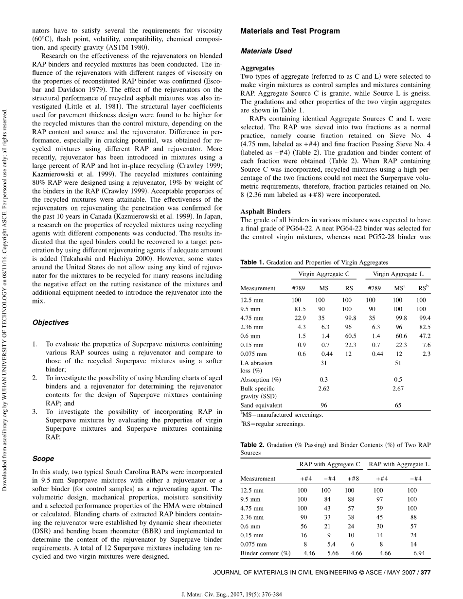 本研究中,两种典型的南卡罗来纳州RAP和再生剂一起加入9.5毫米Superpave沥青混合料,再生剂的组分为再生组分或者为软化组分(对照试验)。得到了热拌沥青混凝土的体积设计,机械性能,湿度敏感性和所选择的性能特性。通过动态剪切流变仪和弯曲梁流变仪来建立含有再生组分的RAP结合料的混合图表,通过Superpave沥青结合料要求来确定再生组分的含量。一共包括12组Superpave混合料实验,其中包括10组再生混合料,2组原始混合料。