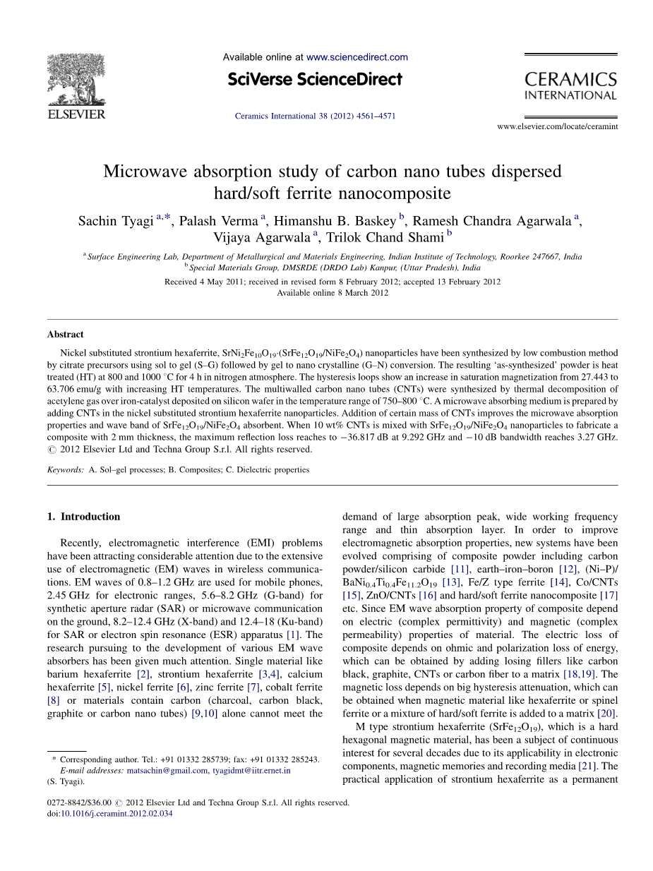 镍置换的锶铁氧体,SrNi2Fe10O19(SrFe12O19/NiFe2O4)纳米微粒利用低燃烧法合成,即以柠檬酸盐为前驱体用溶胶凝胶法实现凝胶到纳米晶体(G-N)的转换。由此产生的“合成”粉末在氮气气氛下在800和1000℃下热处理4h。随着增加热处理温度,磁滞回线显示饱和磁化强度从27.443提高到了63.706emu/g。多壁纳米碳管(CNTs)通过热分解法合成,即在750-800℃的范围内将乙炔气体放置在硅片上的铁催化剂上。微波吸收介质是通过添加多壁纳米碳管在镍置换的锶铁氧体纳米颗粒中来制备的。一定量的多壁碳纳米管的加入提高了微波吸收性能和SrFe12O19/NiFe2O4的波段。当10%质量分数的碳纳米管与SrFe12O19/NiFe2O4纳米微粒混合去制作2mm厚的复合材料,最大反射损耗达在9.292GHz达到了-36.817dB和在3.27GHz时达到了-10dB。