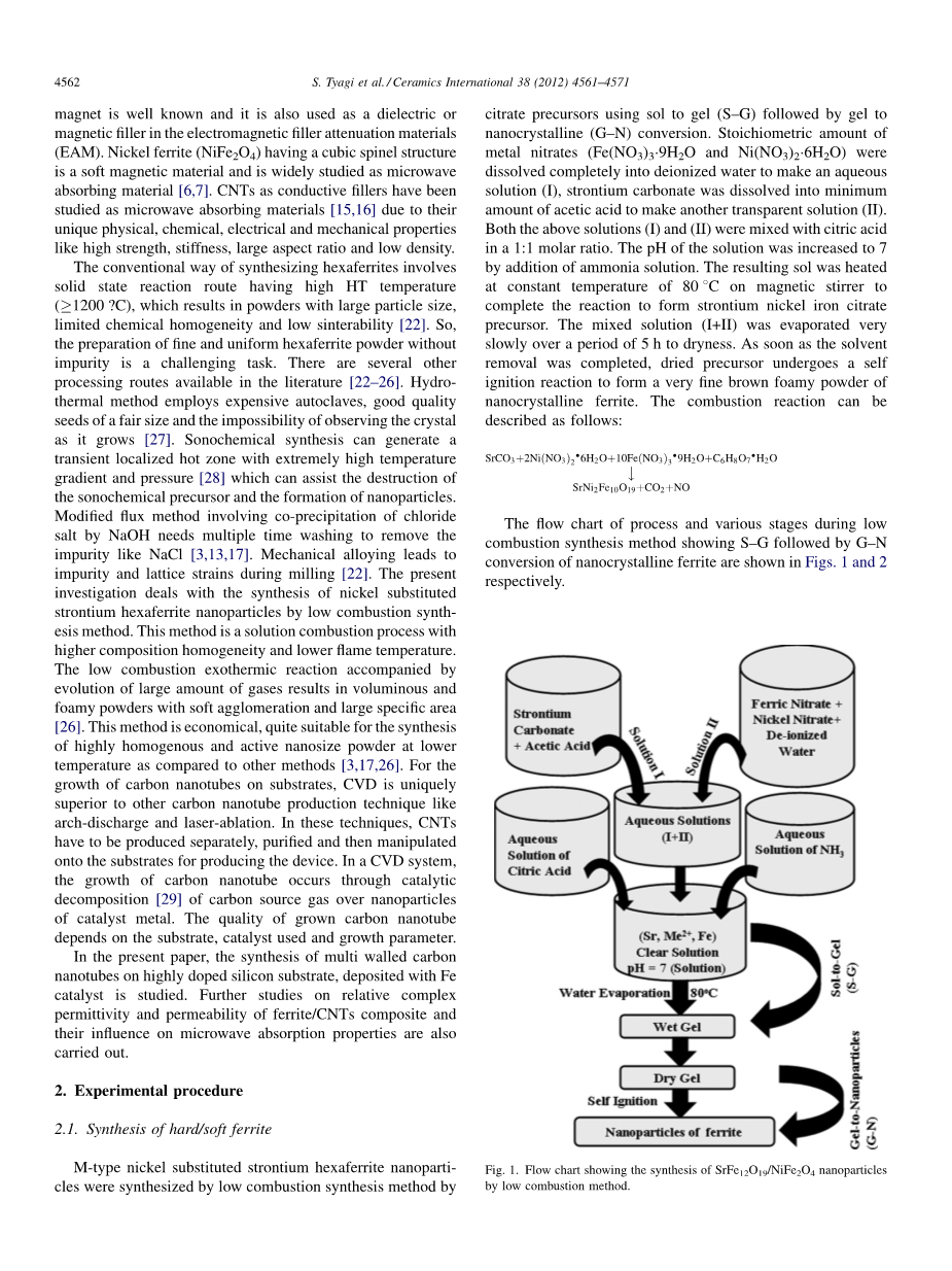 M型镍取代的锶铁氧体颗粒通过低温燃烧法合成,即通过使用柠檬酸前驱体用溶胶-凝胶法实现凝胶到纳米晶的转变。化学计算量的金属硝酸盐(Fe(NO3)3·9H2O和Ni(NO3)2·6H2O)完全溶解于去离子水中制成一种水溶液(I),用最小乙酸的量使碳酸锶去制作另一种透明溶液(Ⅱ)。上述溶液(I)和(II)与柠檬酸一起以1:1的摩尔比混合。溶液的PH值通过加入氨水溶液提高至7。所得到的溶胶加热到80℃在磁力搅拌恒温完成形成锶铁镍前驱体的反应。混合溶液(Ⅰ Ⅱ)的蒸发非常缓慢,5小时至干燥期。当溶剂去除后,干燥前驱体经过自点火反应形成很细的棕色泡沫粉铁氧体纳米晶。燃烧反应可以描述如下: