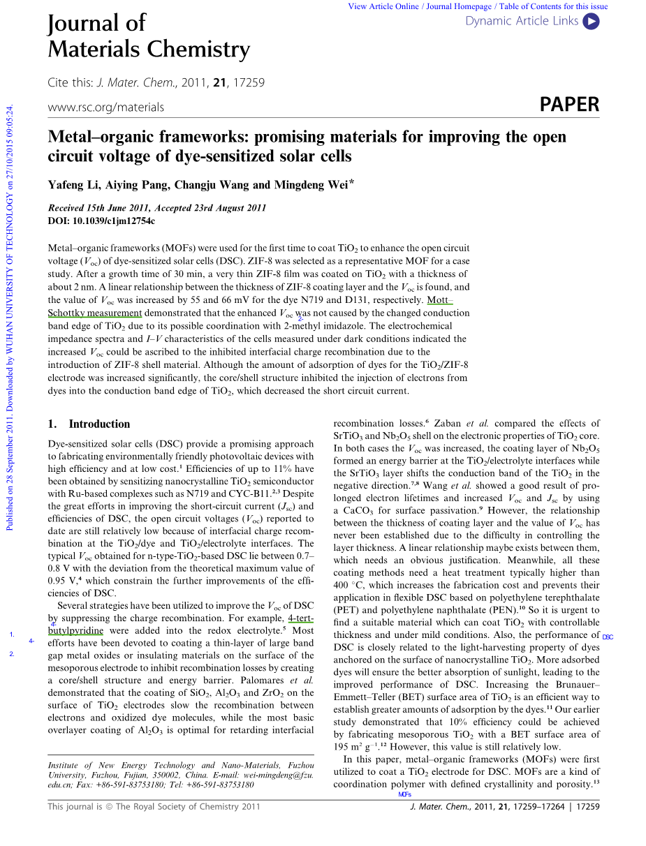 金属有机骨架材料:用于提高染料敏化太阳能电池的开路电压的潜在材料外文翻译资料