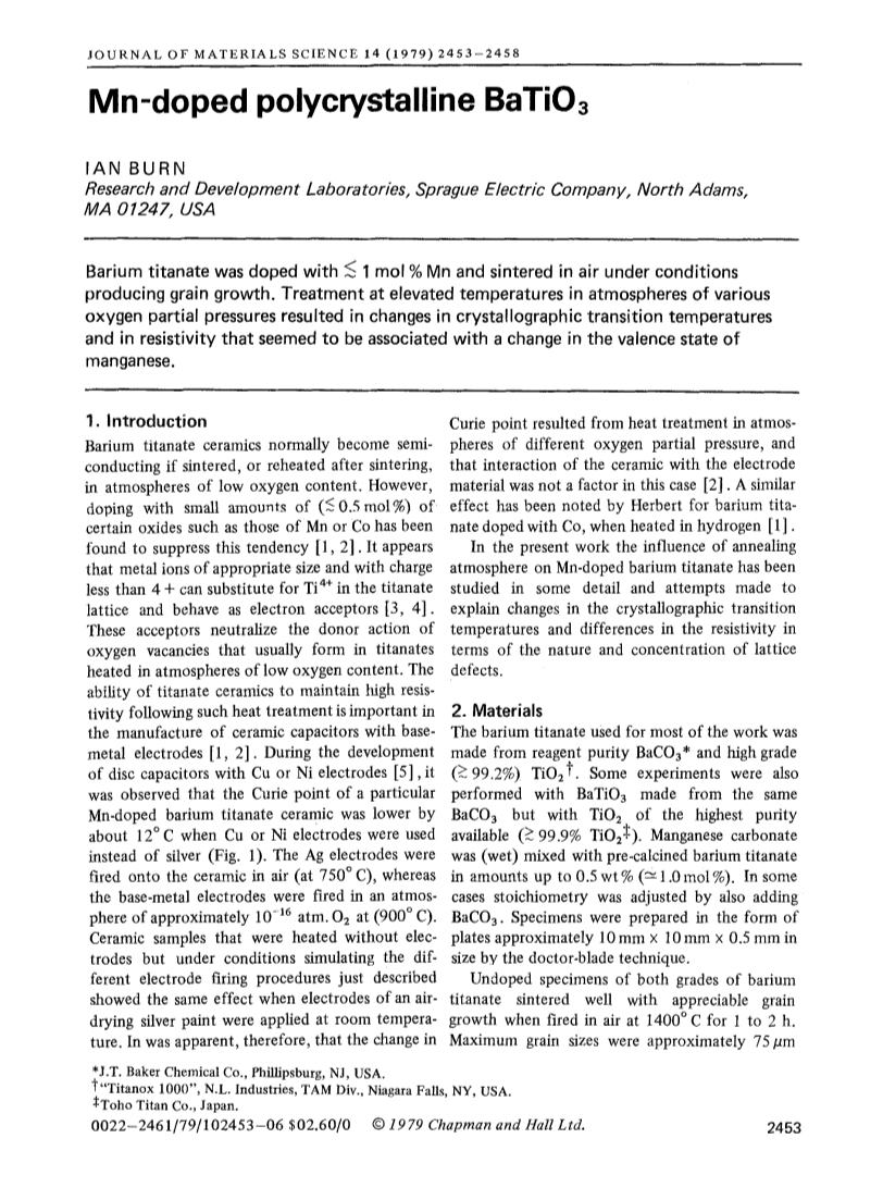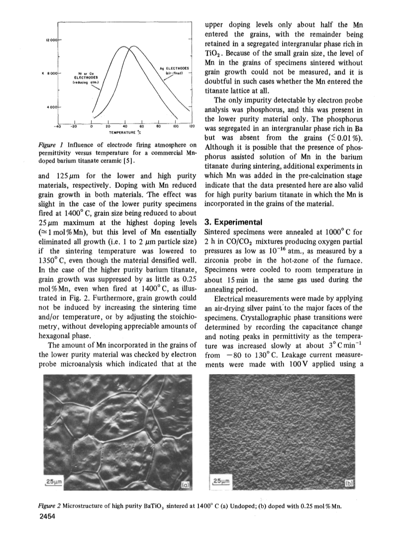 这些在烧结时没有明显的晶粒增长的样本材料,包括掺杂了锰的较高纯度的样本材料或者是这些较低纯度的样本,标本表现的性质就像没有任何掺杂物的钛酸钡一样,同时晶体转变点温度也没有受到退火过程的影响。在这种情况下,锰没有掺杂进入钛酸钡晶格但却以一个晶间相的形式存在钛酸钡中似乎也是可能的。