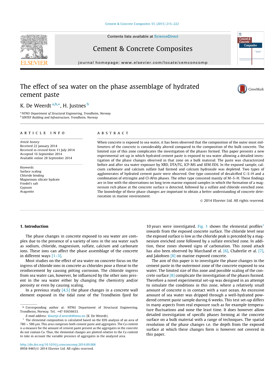 暴露于海水中的混凝土相变化的原因很复杂,可能是各种存在于海水中的离子,例如钠,氯,镁,硫酸钙和碳酸根离子。这些离子可以以不同方式影响[1-3]混凝土的具体的相组合。大部分对混泥土在海水中的影响研究集中在氯离子在混凝土中生成氯化物后使点腐蚀的威胁增强。海水中的氯离子可以,但是,在海水中的其它离子也可以通过改变化学和/或孔隙度,甚至通过使结垢的影响混凝土性能。在先前的研究中[4,5]对在特隆赫姆峡湾10年的潮间带露出的混凝土墙元件的相位变化进行了调查。图1显示出从暴露的混凝土表面向内的元素轮廓。接近暴露表面的氯化物浓度水平低于氯离子峰值,且低于镁离子富集区高于硫酸盐富集区。进行补充的是,这些区域有表现出碳化的迹象。这些区域的改变也得到了Marchand [6],Chabrelie [7]和Jakobsen等人[8]通过暴露于海洋的混凝土的观察。本文的目的是研究在暴露于海水中的混凝土的最外区中的水泥浆体的相位变化。这个限制区域和混凝土表面的缩放大小复杂了相得形成。